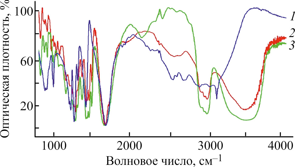 Рис. 2. ИК-спектры (800–4000 см–1) фумаровой кислоты (1), твердой дисперсии фумаровой кислоты и поливинилпирролидона К-12 (2), поливинилпирролидона К-12 (3)