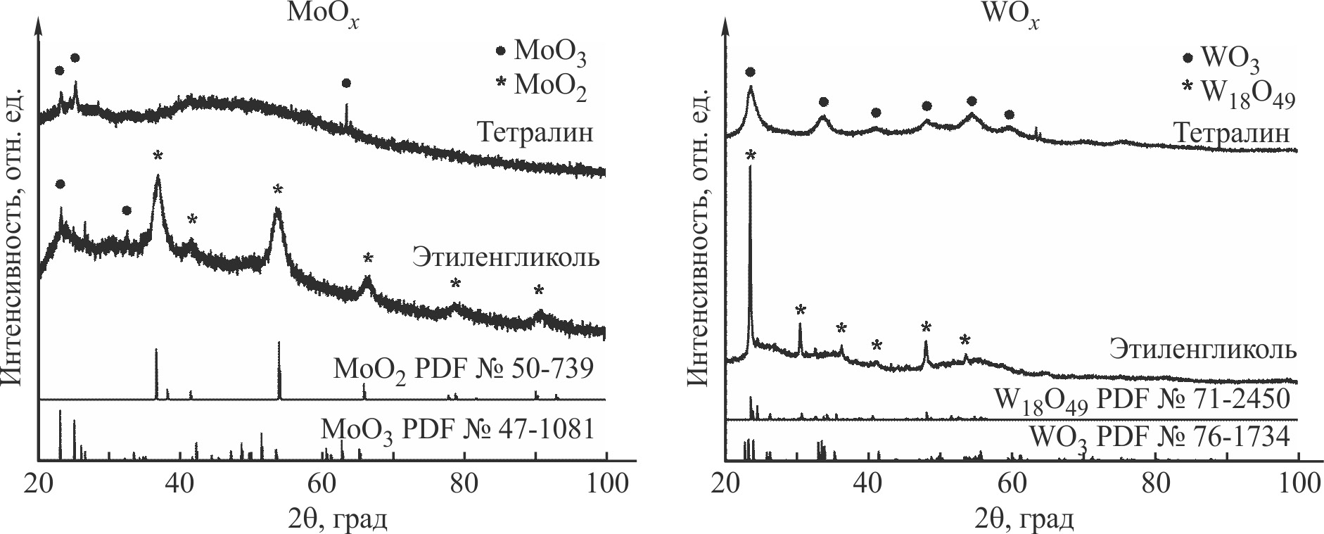 Рис. 1. Дифрактограммы MoOx и WOx, полученных in situ в тетралине и этиленгликоле
