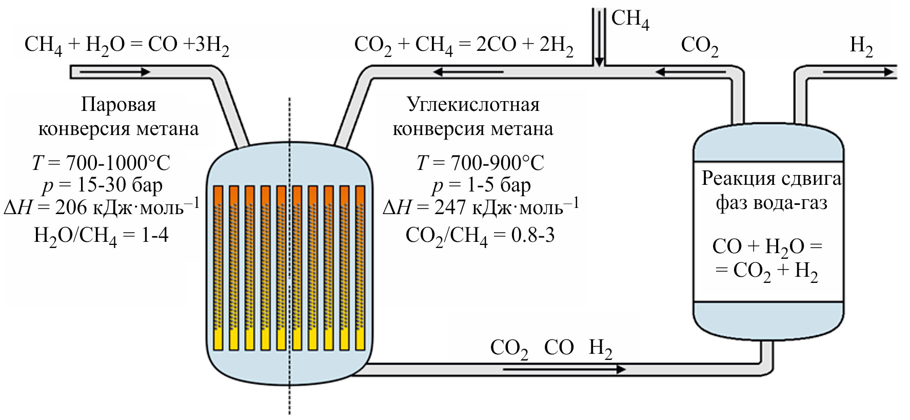Не меньший интерес представляет процесс углекислотного риформинга метана для получения водорода. Традиционно большую часть водорода получают при помощи процесса парового риформинга метана и следующего за ним процесса сдвига фаз вода–газ — в настоящий момент это самый дешевый метод получения водорода с точки зрения капитальных затрат. Сырьем для данного процесса служат метан и вода, а конечными продуктами являются CO2 и H2. Несмотря на возможность отделения диоксида углерода, его дальнейшая очистка, хранение и утилизация в производимых объемах представляется сложной задачей. Полученный таким способом диоксид углерода можно без существенной подготовки использовать в реакции с метаном, получая с высоким выходом синтез-газ с отношением H2/CO около 1. В то же время углекислотную конверсию метана можно рассматривать и как прямую альтернативу паровому риформингу метана, особенно при вовлечении в повторную переработку образующегося CO2: конструкционные различия реакторов парового риформинга метана и углекислотной конверсии метана незначительные, а дальнейшая конверсия получающихся продуктов в ходе процесса сдвига фаз вода–газ для обоих процессов проводится схожим образом (рис. 2). Более того, даже несмотря на бо́льшую энтальпию реакции сухого риформинга метана (247 кДж·моль–1) по сравнению с паровым риформингом метана (206 кДж·моль–1), общие затраты энергии на протекание обоих процессов сопоставимы. Действительно, в случае сухого риформинга метана требуется больше энергии для протекания реакции, но в то же время до трети от всех энергозатрат в процессе парового риформинга метана приходится на нагрев воды и водяного пара. Таким образом, получение водорода при помощи углекислотной конверсии метана представляет интерес не только с научной, но и с коммерческой точки зрения, а также имеет высокие шансы быть реализованным в обозримом будущем.