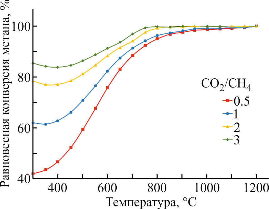 Данная реакция обратимая, поэтому состав продуктов при заданных условиях проведения процесса может может быть оценен c помощью термодинамических расчетов [12]. Из-за эндотермичности реакции и высокой стабильности молекул метана и углекислого газа для достижения удовлетворимых значений конверсии сырья процесс проводят при достаточно высоких температурах — 650–1000°C [13]. Для ускорения достижения термодинамического равновесия в системе и снижения температуры процесс углекислотной конверсии метана проводят в присутствии катализаторов, как правило, на основе никеля или кобальта.