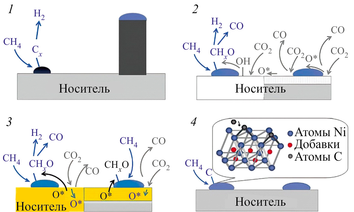 1 — на частицах меньшего размера не образуется нитевидный углерод; 2 — использование носителей с льюисовской основностью; 3 — использование носителей — доноров кислорода; 4 — использование добавок, блокирующих центры роста углерода и его встраивание в Ni (адаптировано из [81]).