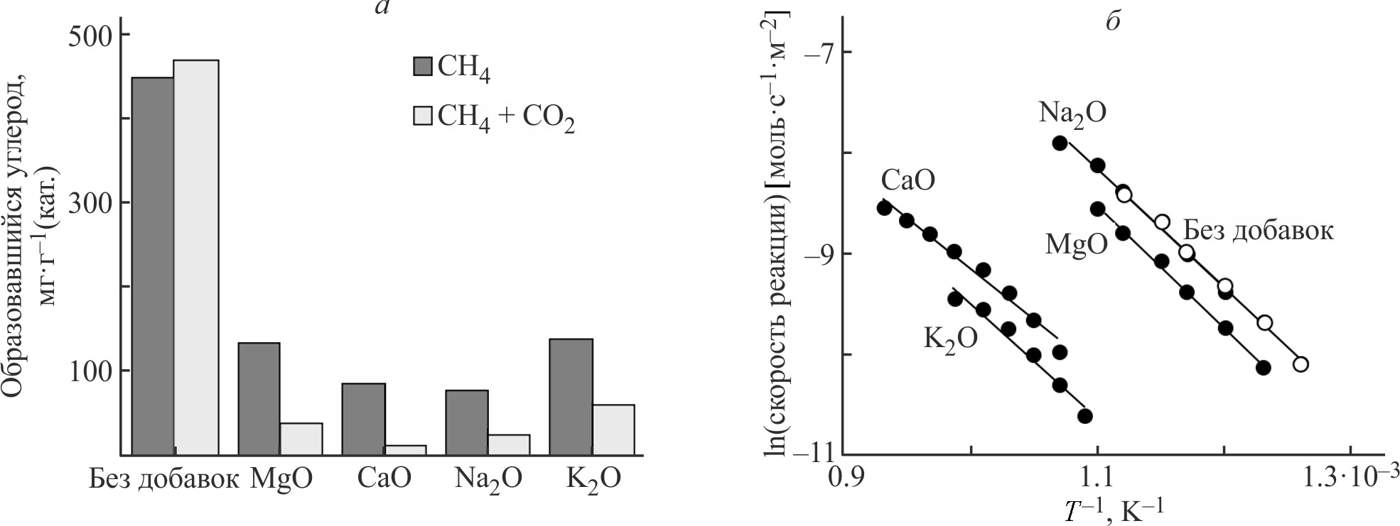 Катализаторы на основе никеля. Катализаторы на основе никеля традиционно используются в процессе углекислотной конверсии метана благодаря его высокой активности, низкой стоимости и доступности. Однако их основной недостаток — быстрая дезактивация из-за закоксовывания [69]. Выше мы указывали причины быстрой дезактивации никелевых катализаторов и факторов, влияющих на скорость образования углерода:
