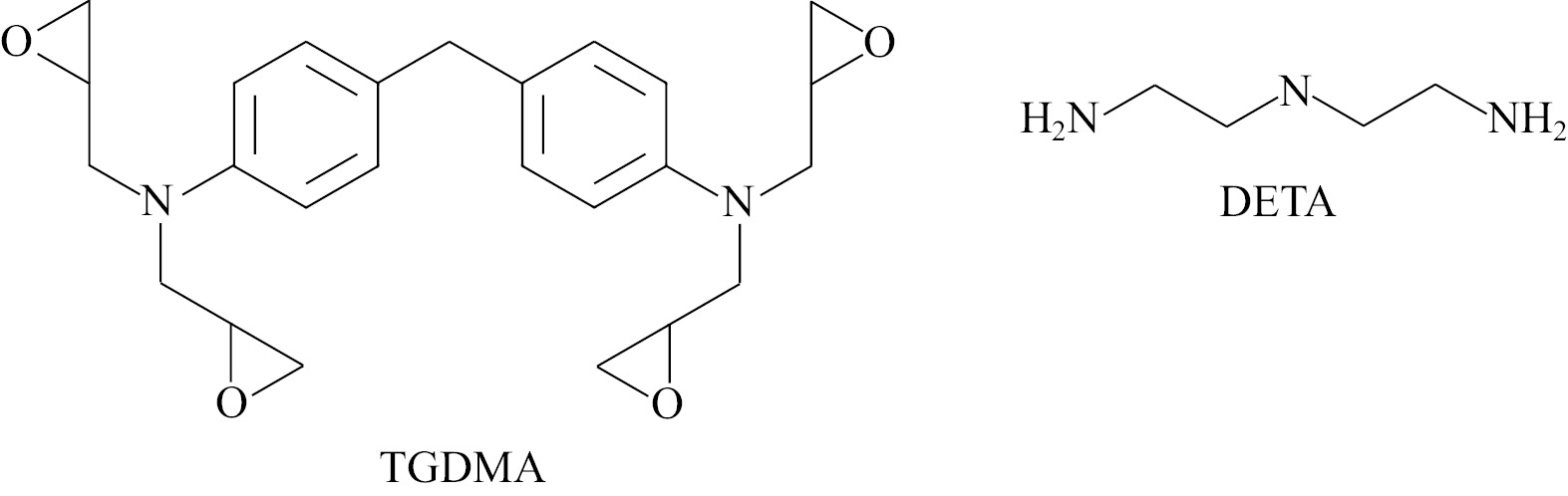 Однако в последнее время важным направлением исследований становится изучение взаимодействия эпоксидных прекурсоров и алифатических ди- и полиаминов [6–8]. Подобные композиции приводят к созданию «умных» полимерных материалов с ценными свойствами, в частности свойством механохромии — способности обратимо менять цвет после деформационных воздействий [9]. Одним из наиболее доступных триаминов является диэтилентриамин (DETA). Несмотря на то что в литературе имеются данные по взаимодействию TGDMA и DETA [9], состав и условия синтеза сополимера TGDMA с DETA в широком диапазоне соотношения реагентов, а также поведение в этой реакции структурных аналогов DETA до сих пор оставались не исследованными.