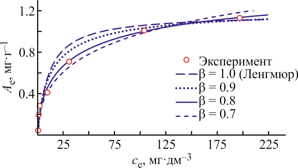 Линейные зависимости построены в координатах /Ae = f() при изменении параметра β от 0.5 до 1.0. Параметры изотермы Ленгмюра–Фрейндлиха приведены в табл. 6. При β = 1.0 уравнение (15) переходит в уравнение Ленгмюра.