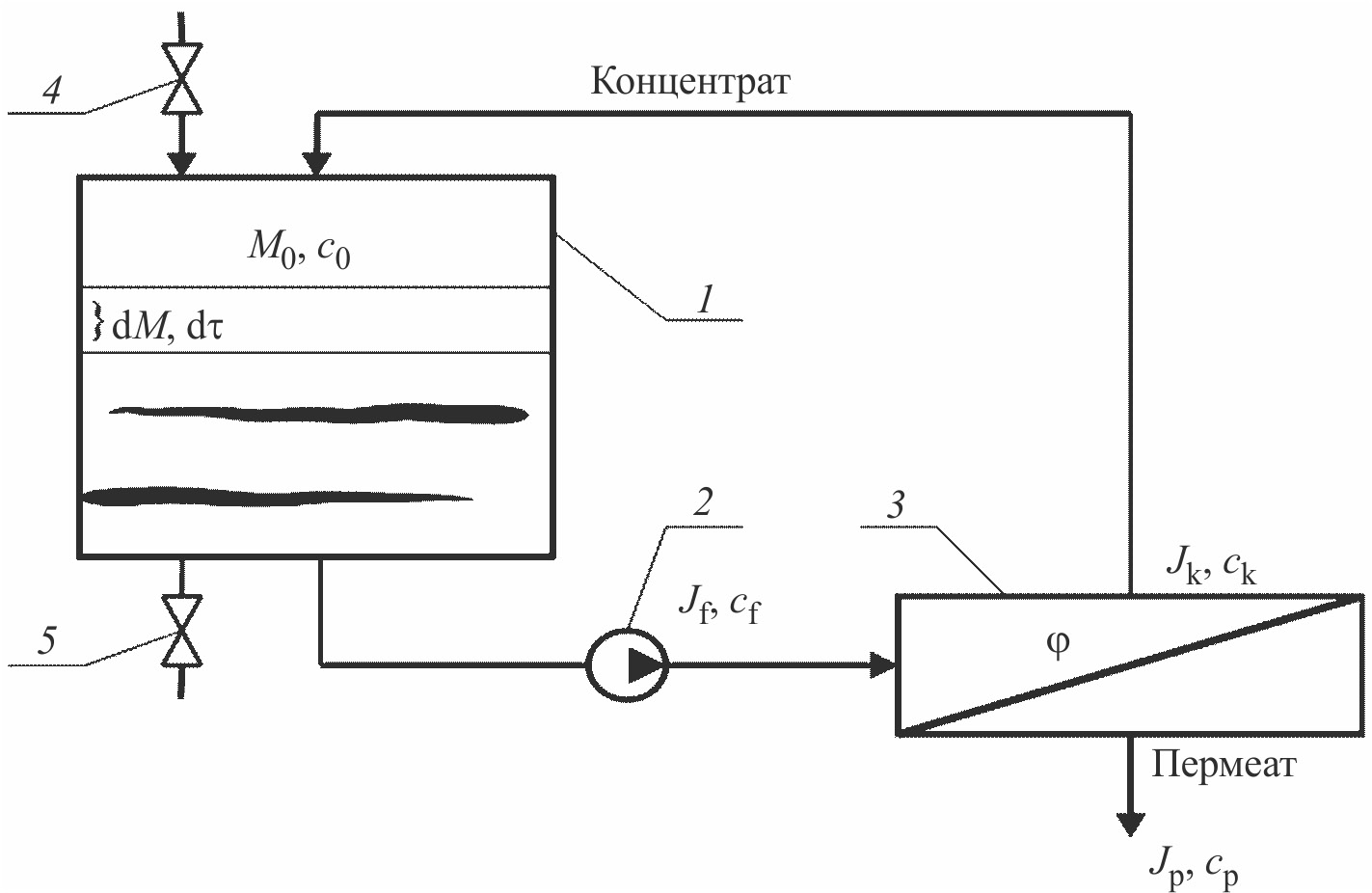 1 — резервуар с ОММ, 2 — насос, 3 — трубчатый мембранный модуль, 4 — вентиль для заполнения резервуара, 5 — вентиль для отвода концентрата.
