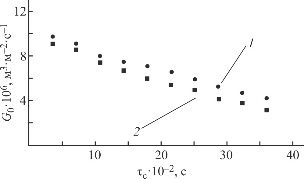 Гидравлическое сопротивление мембраны Rm было определено предварительно на чистом масле той же марки после выхода удельной производительности мембраны G0 на плато (рис. 3) по выражению (4) и составляло 7·1012 м–1.