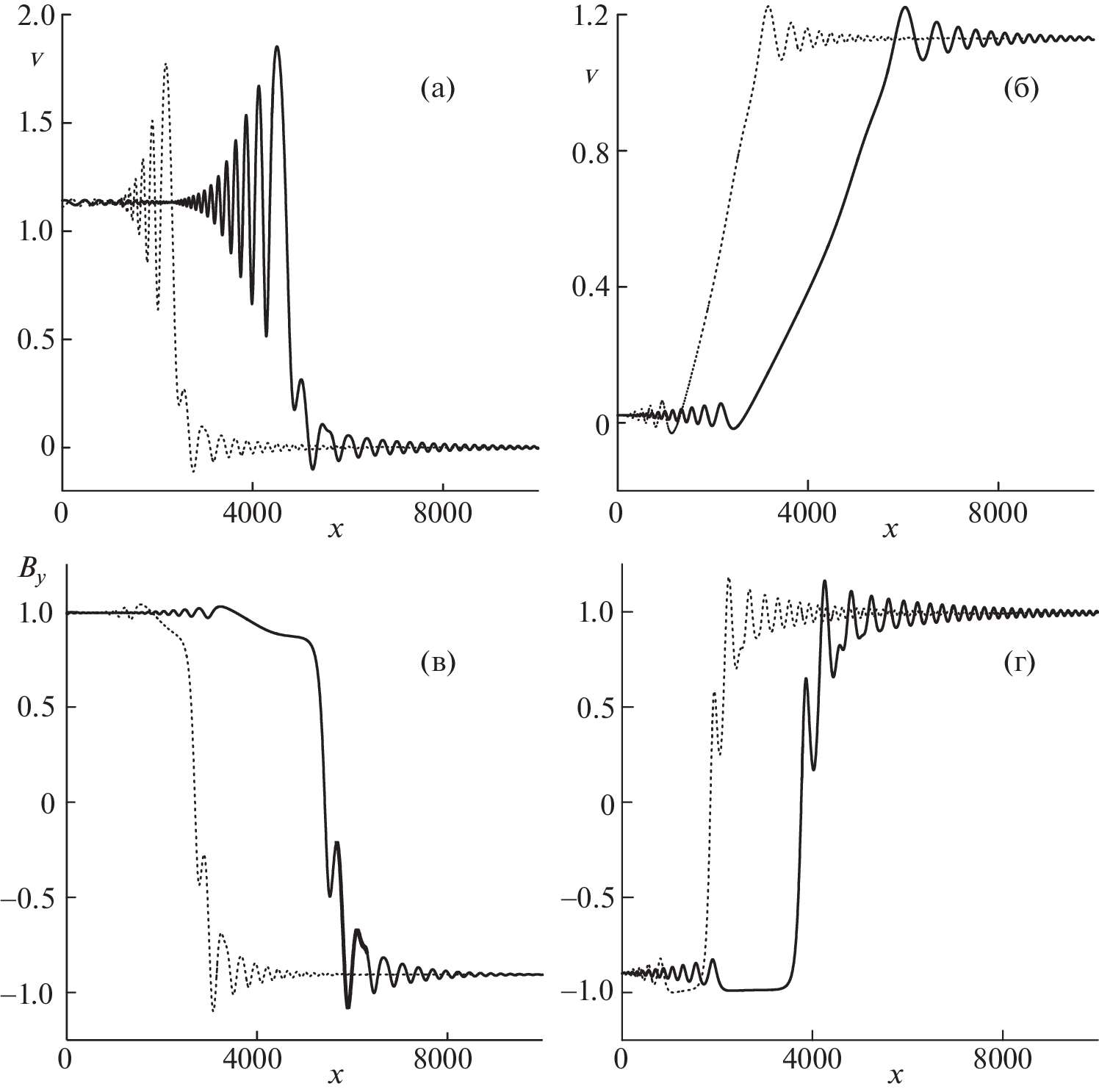 Рассматриваются бездиссипативные и слабодиссипативные структуры разрывов. Для этого используется специальный метод численного анализа для исследования периодических волн. Исследуется расположение ветвей периодических решений. Уединенные волны и структуры бездиссипативных разрывов ищутся как предельные решения. Обнаружено, что помимо резонанса длинных альвеновских волн с короткими быстрыми и медленными магнитозвуковыми волнами встречается и резонанс с длинными волнами, приводящий к появлению уединенных волн и структур разрывов гибридного типа. Сделаны расчеты уравнений в частных производных для выяснения, наблюдаются ли найденные структуры. Библ. 17. Фиг. 7.