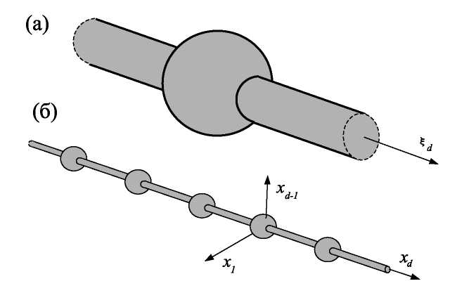Фиг. 1. Волновод с резонатором (a) и тонкий цилиндр с периодическим семейством узлов (б).