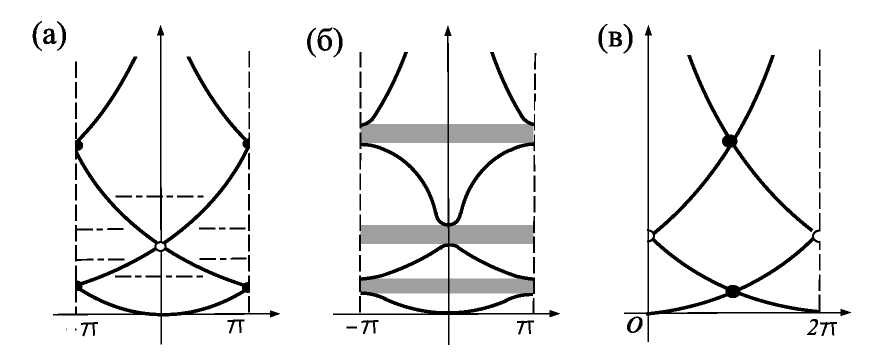 В итоге видим, что вблизи узла две пересекающиеся предельные дисперсионные кривые (см. формулу (42) и фиг. 3a) распадаются и согласно определению (15) раскрывают лакуну при малом так, как указано на фиг. 3б для случая . При такой вывод сделать нельзя, поскольку согласно (50) графики функций остаются пересекающимися прямыми, а их общая точка пересечения сдвигается вдоль оси ординат по закону (41).