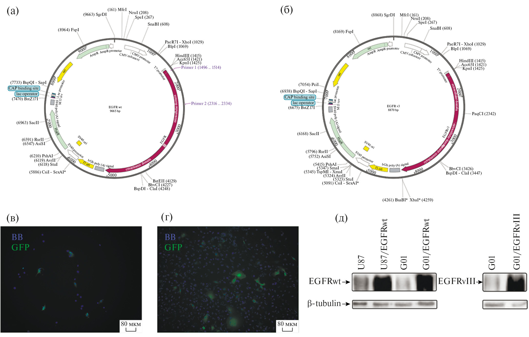 Fig. 1. (а) – Plasmid map of the vector EGFRwt/CMV3; (б) – Plasmid map of the vector EGFRvIII/CMV3; Evaluation of the efficiency of transfection of G01(в) cell culture and U87 (г) cell line by human glioblastoma, GFP – green. The cell nuclei were stained with bisbenzimide (Hoechst 33342, Sigma) – blue. (д) – Analysis of EGFR expression in control and transgenic cells of the human glioblastoma cell line U87 and in patient-derived human glioblastoma G01 cultured cells. Normalised for beta-tubulin.