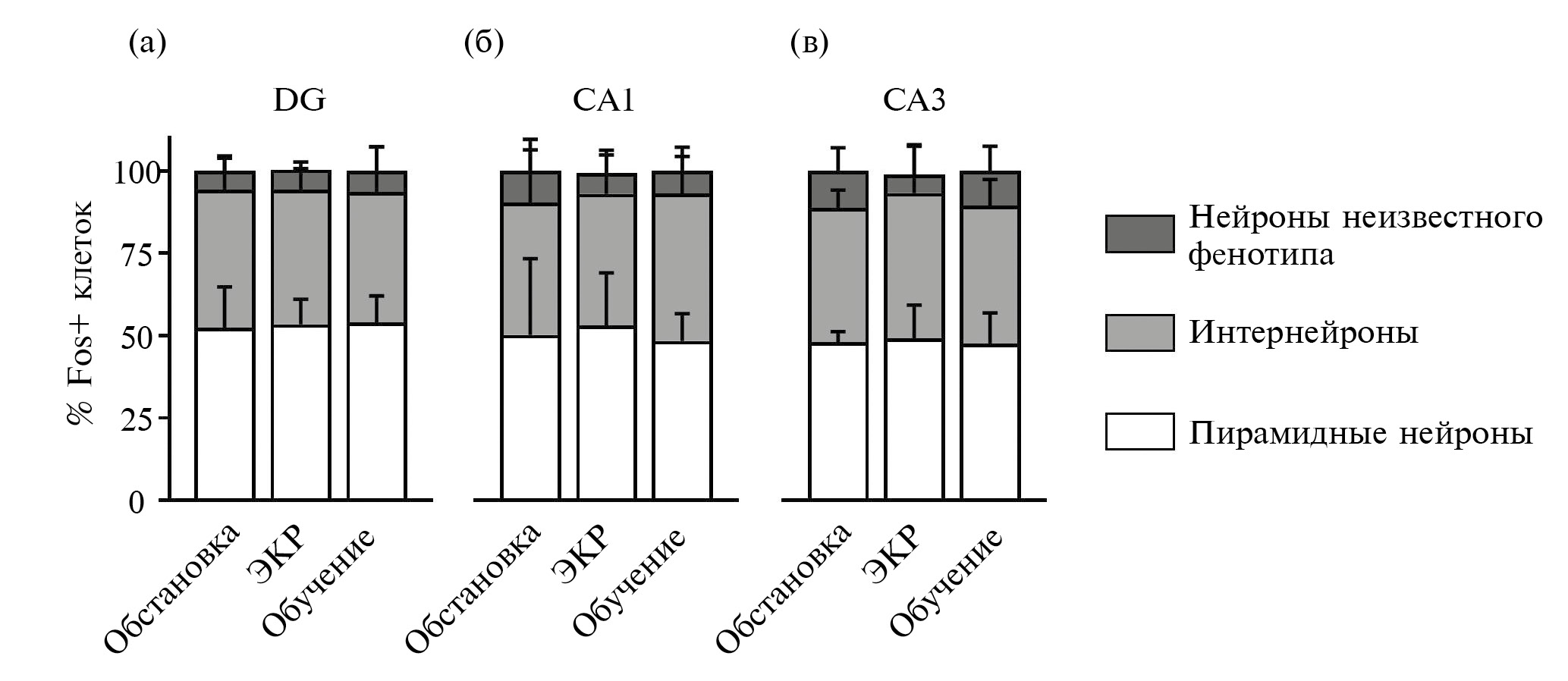 Было показано, что пропорция пирамидных нейронов, интернейронов и нейронов неизвестного фенотипа среди Fos+-клеток, активированных извлечением памяти, является практически постоянной и не зависит ни от области гиппокампа, ни от предыдущего опыта животных. Так, во всех исследованных областях и у всех экспериментальных групп доля Fos+Emx1+-нейронов составляла в среднем 47–54%, доля Fos+GAD+-нейронов – 40–45% и доля Fos+-нейронов неизвестного фенотипа – 6–11%. При этом доля Fos+-нейронов неизвестного фенотипа во всех областях гиппокампа была значимо меньше, чем доли Fos+Emx1+и Fos+GAD+-нейронов (зубчатая фасция, рис. 3 (а): фактор “тип клеток”: F (1.337, 16.05) = 120.4, р < 0.0001, фактор “группа мышей”: F (2, 12) = 1.0, р = 0.4, взаимодействие факторов: F (4, 24) = 0.07, р = 0.99, попарные сравнения доли нейронов неизвестного фенотипа и пирамидных или интернейронов: р < 0.0001; область СА1, рис. 3 (б): фактор “тип клеток”: F (1.206, 14.47) = 42.72, р < 0.0001, фактор “группа мышей”: F (2, 12) = 1.0, р = 0.4, взаимодействие факторов: F (4, 24) = 0.22, р = 0.92, попарные сравнения доли нейронов неизвестного фенотипа и пирамидных или интернейронов: р < 0.0001; область СА3, рис. 3 (в): фактор “тип клеток”: F (1.892, 22.70) = 89.85, р < 0.0001, фактор “группа мышей”: F (2, 12) = 1.0, р = 0.4, взаимодействие факторов: F (4, 24) = 0.45, р = 0.77, попарные сравнения доли нейронов неизвестного фенотипа и пирамидных или интернейронов: р < 0.0001). Доли Fos+Emx1+и Fos+GAD+-нейронов были равными и не различались в областях СА1 и СА3 (попарные сравнения: р > 0.2), а в зубчатой фасции Fos+-пирамидных нейронов было несколько больше, чем Fos+-интернейронов (р = 0.01). Интересно, что пропорция активированных нейронов разного типа оставалась постоянной во всех областях гиппокампа, независимо от того, извлекали ли мыши аверсивную ассоциативную память об обстановке (группа “Обучение”), неассоциативную обстановочную память (группа “Обстановка”) или обследовали обстановку, ранее сочетавшуюся с немедленным ЭКР, но не запомненную животными (группа “ЭКР”), – как описано выше, фактор “группа мышей” не был значим ни в одной из изученных областей.