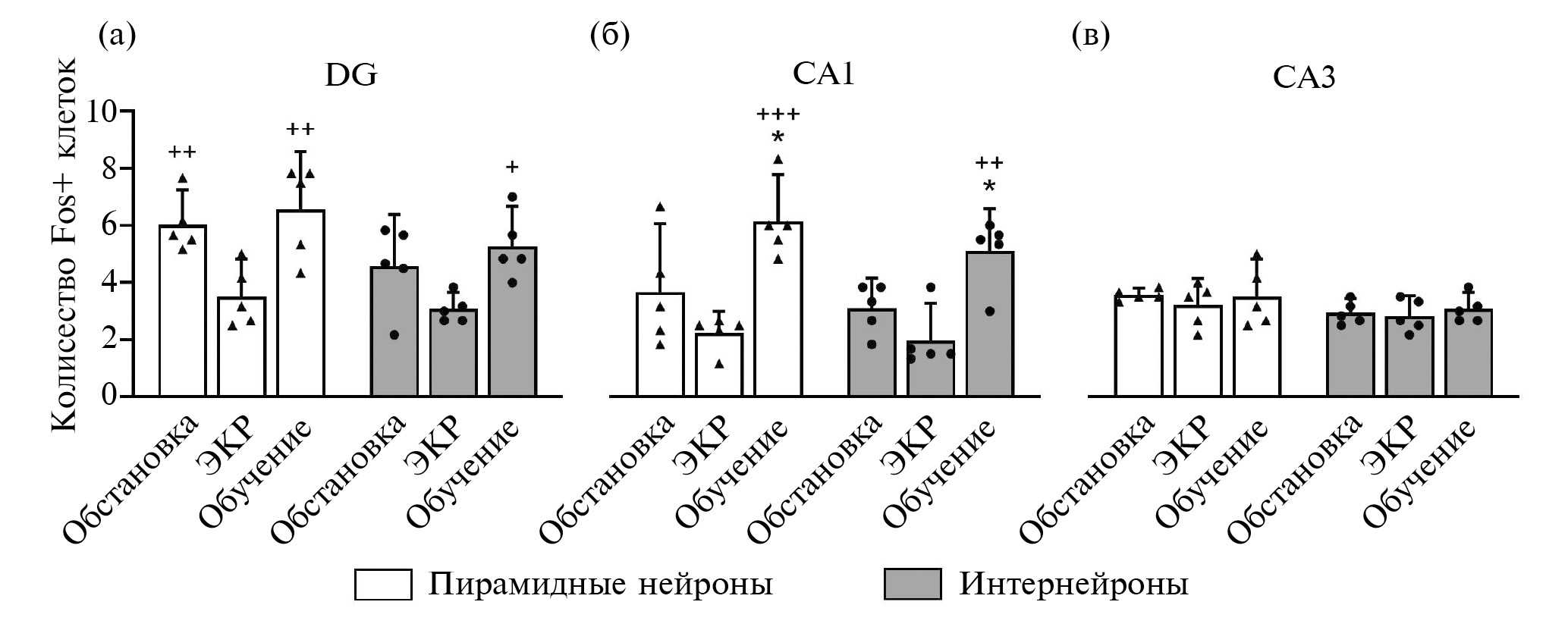 Рис. 4. Количество активированных по с-Fos пирамидных Emx1+-нейронов и GAD+-интернейронов в различных областях гиппокампа у мышей разных групп при извлечении памяти об обстановке. (а) зубчатая фасция (DG), (б) область СА1, (в) область СА3. * – p < 0.05 по сравнению с группой “Обстановка”, + – p = 0.02, ++ – p < 0.01, +++ – p = 0.0001 по сравнению с группой “ЭКР”, апостериорный критерий Тьюки.