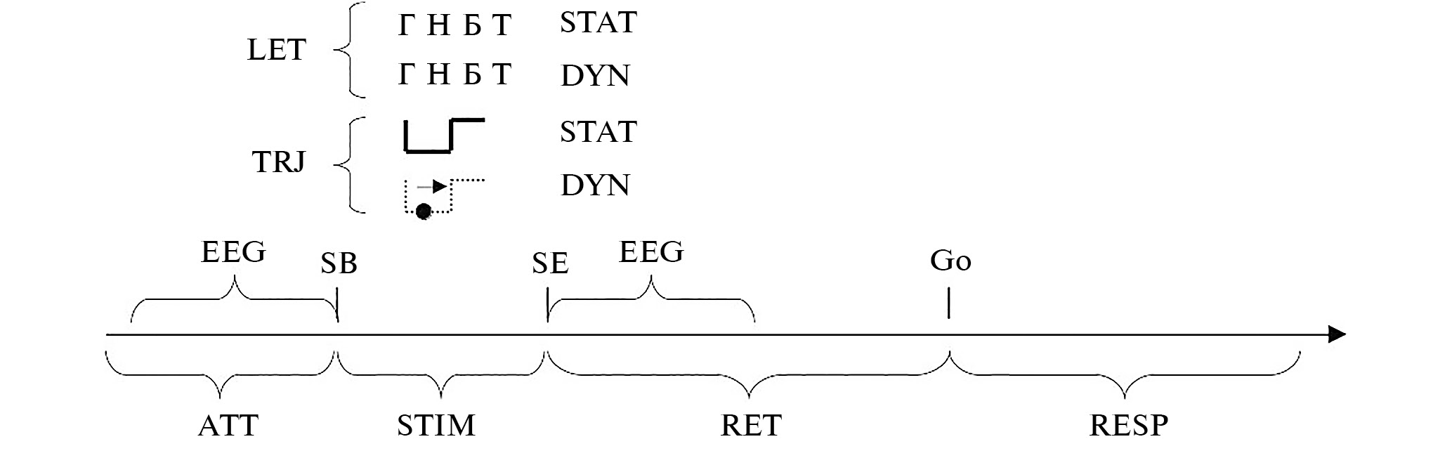 Эксперимент состоял из четырех блоков, каждый из которых соответствовал одному из четырех экспериментальных кросс-условий – одному из четырех возможных сочетаний модальности (LET и TRJ) и режима предъявления (STAT, DYN). Каждый блок включал в себя 48 проб. Пробы внутри каждого блока содержали последовательности разной длины (по 16 проб для каждой длины): последовательности букв состояли из 3, 4 или 5 элементов, а траектории – из 4, 5 или 6 элементов. В половине проб для последовательности каждой длины, каждой модальности в каждом режиме предъявления (16 проб) задержка императивного сигнала составляла 500 мс, а в другой половине – 3000 мс. Порядок проб с последовательностями разной длины внутри каждого блока был псевдослучайным, индивидуальным для каждого испытуемого. Порядок выполнения блоков также варьировался: половина испытуемых сначала выполняли блоки LET, а затем TRJ, а другая половина – наоборот.