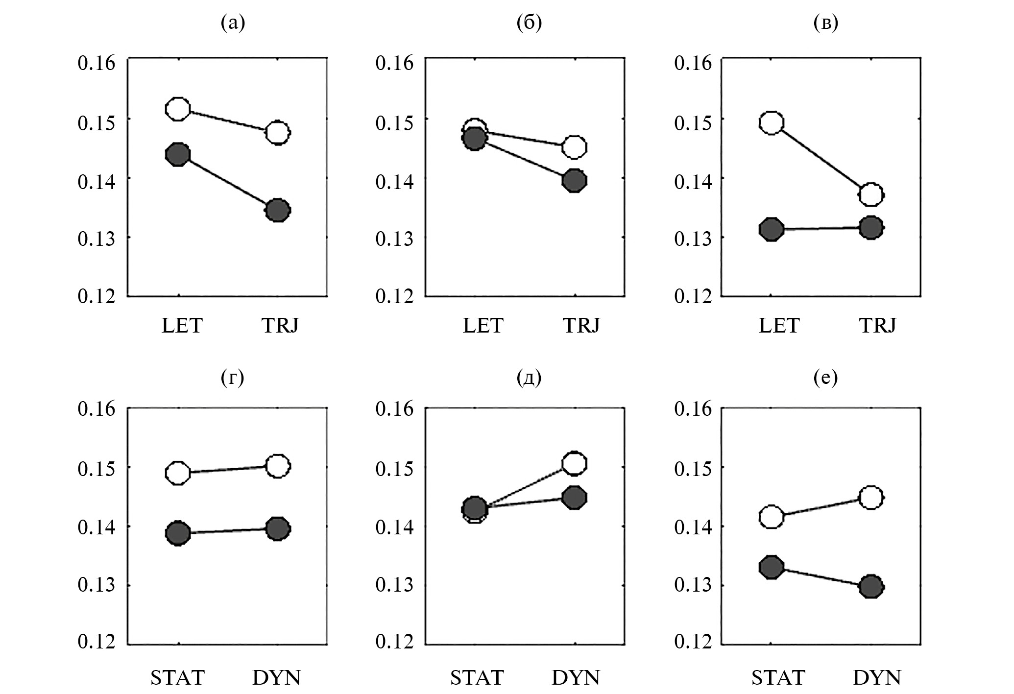 Последовательности предъявлялись в двух режимах – статическом (STAT) и динамическом (DYN). В статическом режиме последовательность предъявлялась одновременно вся целиком на фиксированное время (T = 2000 мс). В этом режиме в случае LET предъявлялась строчка букв, а в случае TRJ – рисунок ломаной. В динамическом режиме в случае LET буквы предъявлялись одна за другой, каждая на своем месте в строке. В случае TRJ вдоль невидимой траектории двигалось небольшое круглое пятно. В случае LET, так же как и в случае TRJ, время экспозиции одного элемента (буквы или отрезка) составляло 500 мс. Примеры буквенных последовательностей и траекторий можно найти в нашей предыдущей работе (Корнеев и др., 2022).