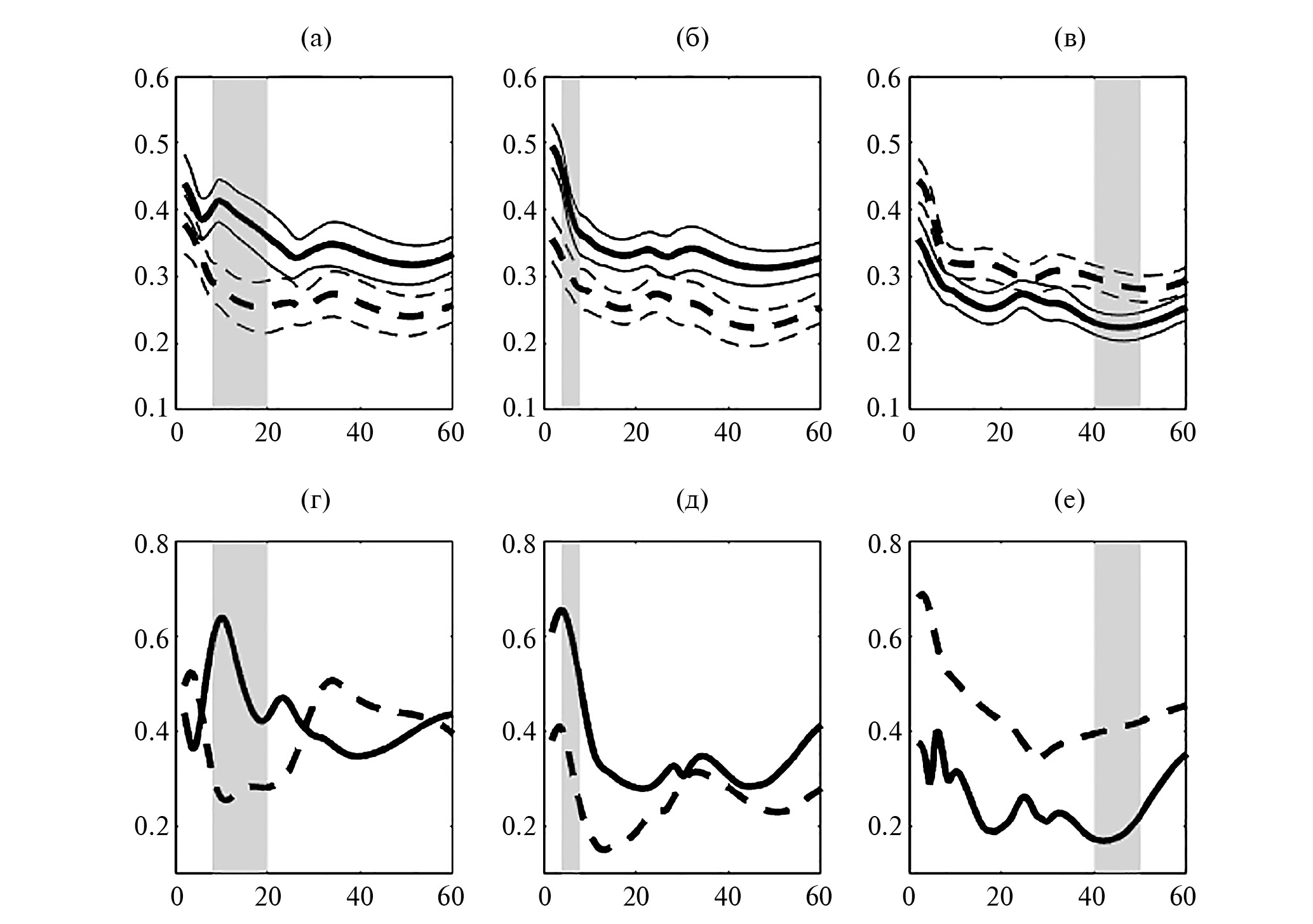 В верхнем ряду панелей ((а), (б), (в)) жирная кривая (сплошная или штриховая) означает среднюю по группе испытуемых зависимость, а соответствующими сплошными или штриховыми тонкими линиями выше и ниже нее обозначен коридор (среднее ± стандартная ошибка). В нижнем ряду панелей ((г), (д), (е)) показаны примеры соответствующих верхним кривым индивидуальных зависимостей COH(f): (г) содержит индивидуальный пример для (а), (д) – для (б) и (е) – для (в). Светло-серая вертикальная полоса отмечает частотные области, в которых две кривые, показанные на панелях ((а), (б), (в)), отличаются статистически значимо. Эти же вертикальные полосы воспроизведены на соответствующих примерах индивидуальных кривых ((г), (д), (е)).