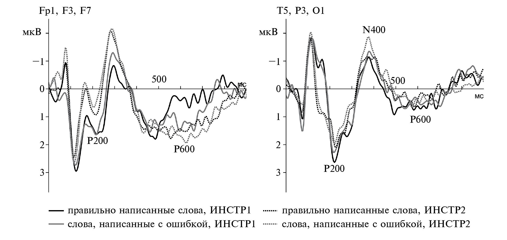 Статистический анализ выполняли в программе STATISTICA 8. Для анализа поведенческих данных (процента ошибок и время реакции) использовали t-тест. Для анализа ССП выполняли дисперсионный анализ с повторными измерениями (RM ANOVA). Исследовали следующие компоненты ССП: P200 во временном окне 180–260 мс, N400 во временном окне 350–500 мс, P600 во временном окне 500–750 мс. RM ANOVA применяли к средней амплитуде в каждом исследуемом временном окне в 9 областях интереса: левая передняя область (Fp1, F3, F7), средняя передняя область (Fz), правая передняя область (Fp2, F4, F8), левая центральная область (T3, C3), центральная область (Cz), правая центральная область (T4, C4), левая задняя область (T5, P3, O1), средняя задняя область (Pz) и правая задняя область (T6, P4, O2). Амплитуду ССП усредняли по электродам в каждой интересующей области. Дисперсионный анализ включал следующие факторы: ОРФОГРАФИЯ (2 уровня: правильно написанные слова и слова с ошибками), ПОЛУШАРИЕ (3 уровня: левая, правая и средняя линия электродов) и ПОЛОЖЕНИЕ ЭЛЕКТРОДА (3 уровня: передний, центральный и задний). Тип моторного ответа (правый правой рукой для правильных – ИНСТР1 и левый левой рукой для правильных – ИНСТР2) использовали в качестве группового фактора статистической модели. При определении достоверности эффектов учитывали поправку Гринхауса-Гейссера. Поправка Бонферрони использовалась для апостериорного анализа, приведенные в тексте значения даны с учетом поправки.