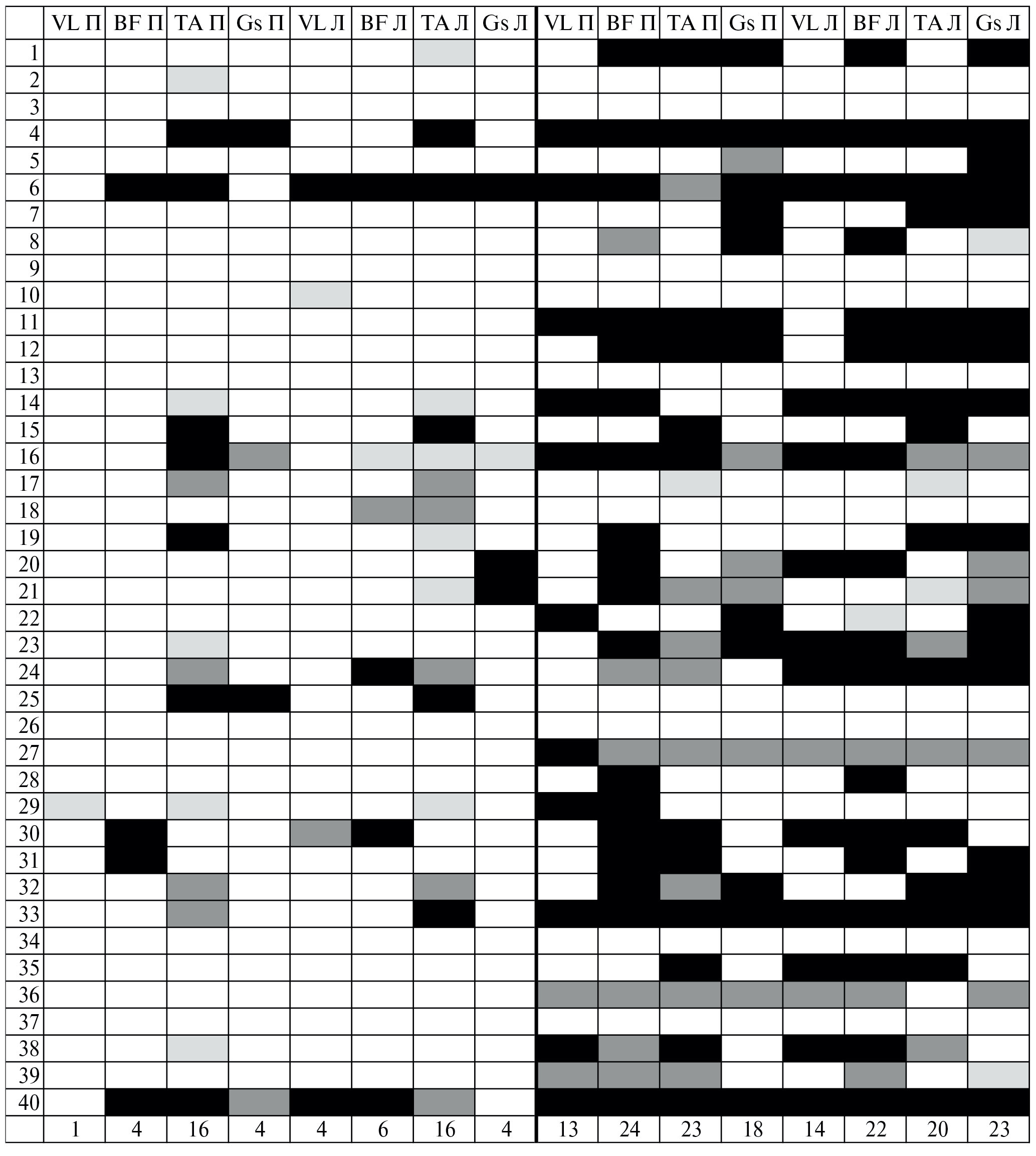 Fig. 3. Individual characteristics of EMG activity of all studied muscles of the lower extremities during motor imagery using a neurointerface with and without activation of the mechanical training device. Rows: subjects, columns: muscles. Black rectangles indicate the presence of burst activity, light gray rectangles indicate tonic activity, dark gray rectangles indicate both burst and tonic activity. Bottom row: number of subjects who had any type of EMG activity (burst and/or tonic) in the corresponding muscle.
