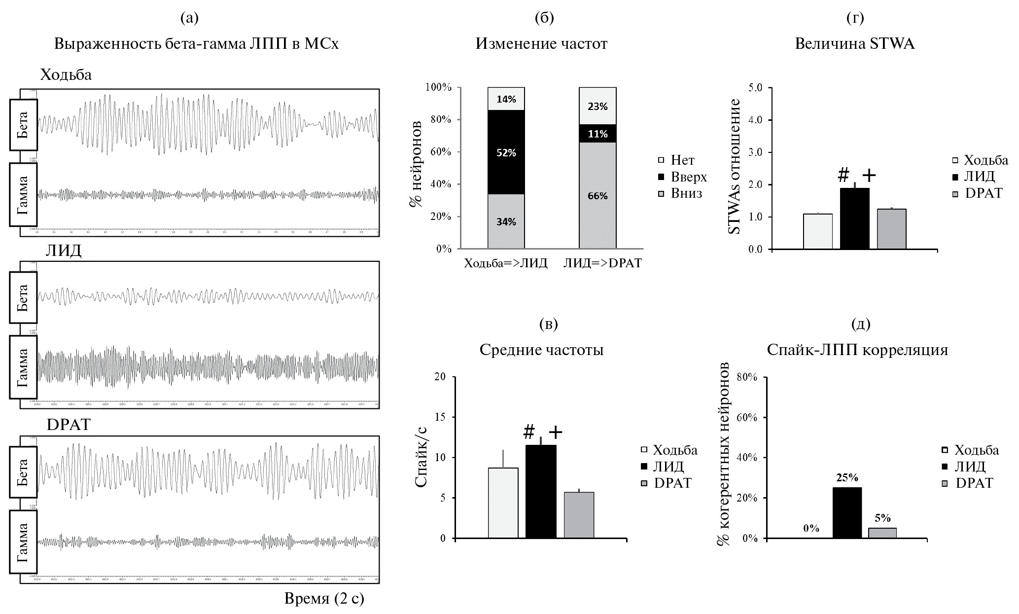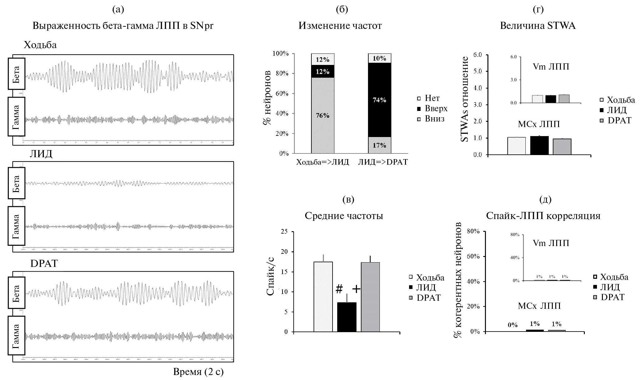 Рис. 3. Изменения частот активности нейронов вентромедиального ядра таламуса при ЛИД и фазовой синхронизации их спайков с ЛПП MCx. (а) – осцилляторная активность ЛПП в Vm в 3 последовательных записях до, после введения леводопы и DPAT. Необработанные сигналы (длительность 2 с) отфильтрованы в выбранных диапазонах частот – бета (30–36 Гц) и гамма (80–120 Гц). ЛПП бета- и гамма-осцилляции перед введением леводопы (верхняя вставка); в период ЛИД (средняя вставка) и после введения DPAT (нижняя вставка). (б) – изменение частот нейронной активности в 3 состояниях на популяционном уровне. Левый столбец представляет изменение частот при ЛИД в сравнении с периодом ходьбы до введения леводопы. Правый столбец представляет изменения частот при переходе от ЛИД к DPAT. Цвет столбцов определяет направление изменения характеристики: возрастaние (черный), снижение (серый) или отсутствие изменений (светло-серый). (в) – частота активности нейронов (спайк/с) до введения леводопы, при ЛИД и после DPAT. (г–д) – синхронизация cпайков с ЛПП в моторной нейросети: (г) – средние отношения амплитуд STWAs, характеризующие спайк-ЛПП-синхронизацию до введения леводопы, во время ЛИД и после введения DPAT; (д) – % нейронов, имеющих выраженную спайк-ЛПП-синхронизацию до введения леводопы, при ЛИД и после введения DPAT. Для (в), (г) и (д) две эпохи (по 100 с) взяты для одних и тех же идентифицированныx нейронов в трех последовательных записях – ходьбе до введения леводопы (светло-серые столбцы), во время ЛИД (черные столбцы) и после введения DPAT (серые столбцы). Значения представлены в процентах или в виде среднего значения ± SEM. # – различия с данными, полученными при ходьбе до введения леводопы; + – различия с данными, полученными после введения DPAT.