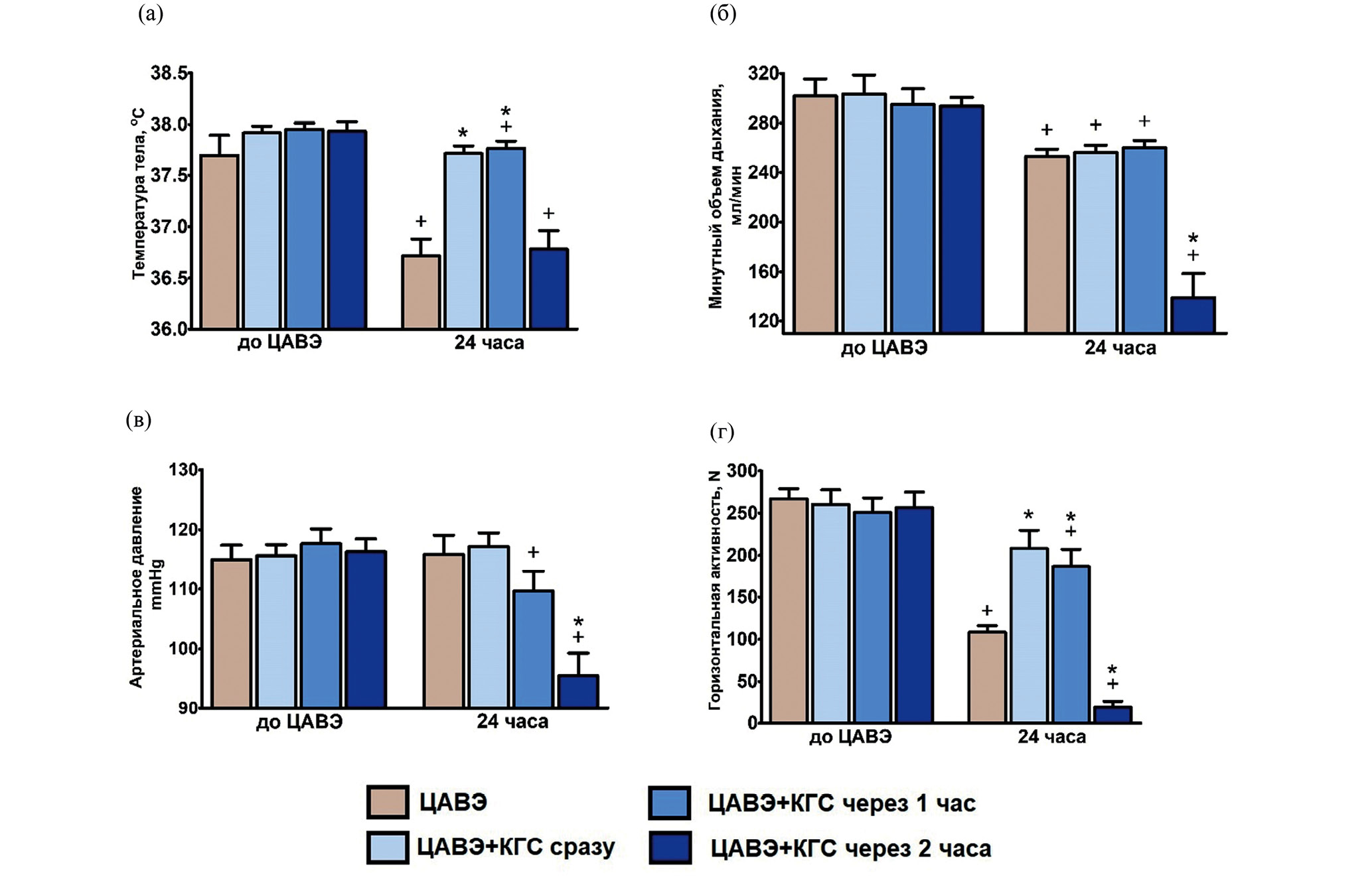 Рис. 1. Результаты функциональных тестов до моделирования ЦАВЭ и через 24 часа после моделирования ЦАВЭ. (а) – температура тела, (б) – минутный объем дыхания, (в) – артериальное давление, (г) – горизонтальная активность в открытом поле. Примечание: * – p < 0.05 в сравнении с группой ЦАВЭ, + – p < 0.05 в сравнении с параметрами до моделирования ЦАВЭ одной группы.