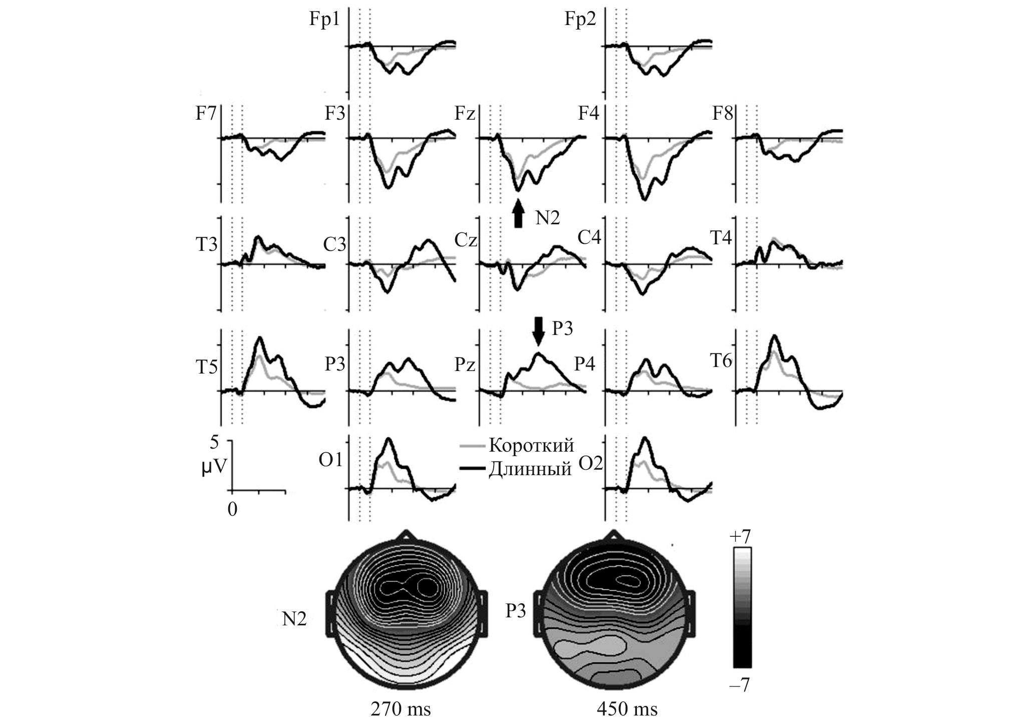 Результаты расчета ПСС. На рис. 1 представлены ПСС, усредненные по всем испытуемым и обеим записям (до, после) отдельно для коротких (серый цвет) и длинных (черный цвет) стимулов. Отмечены две стандартные составляющие ПСС — волна N2 (с латентностью 270 мс), имеющая лобную локализацию, и волна P3 (с латентностью 450 мс), имеющая теменно-височную локализацию. Данный расчет производился для традиционного выделения компонент ПСС в используемом слуховом тесте.