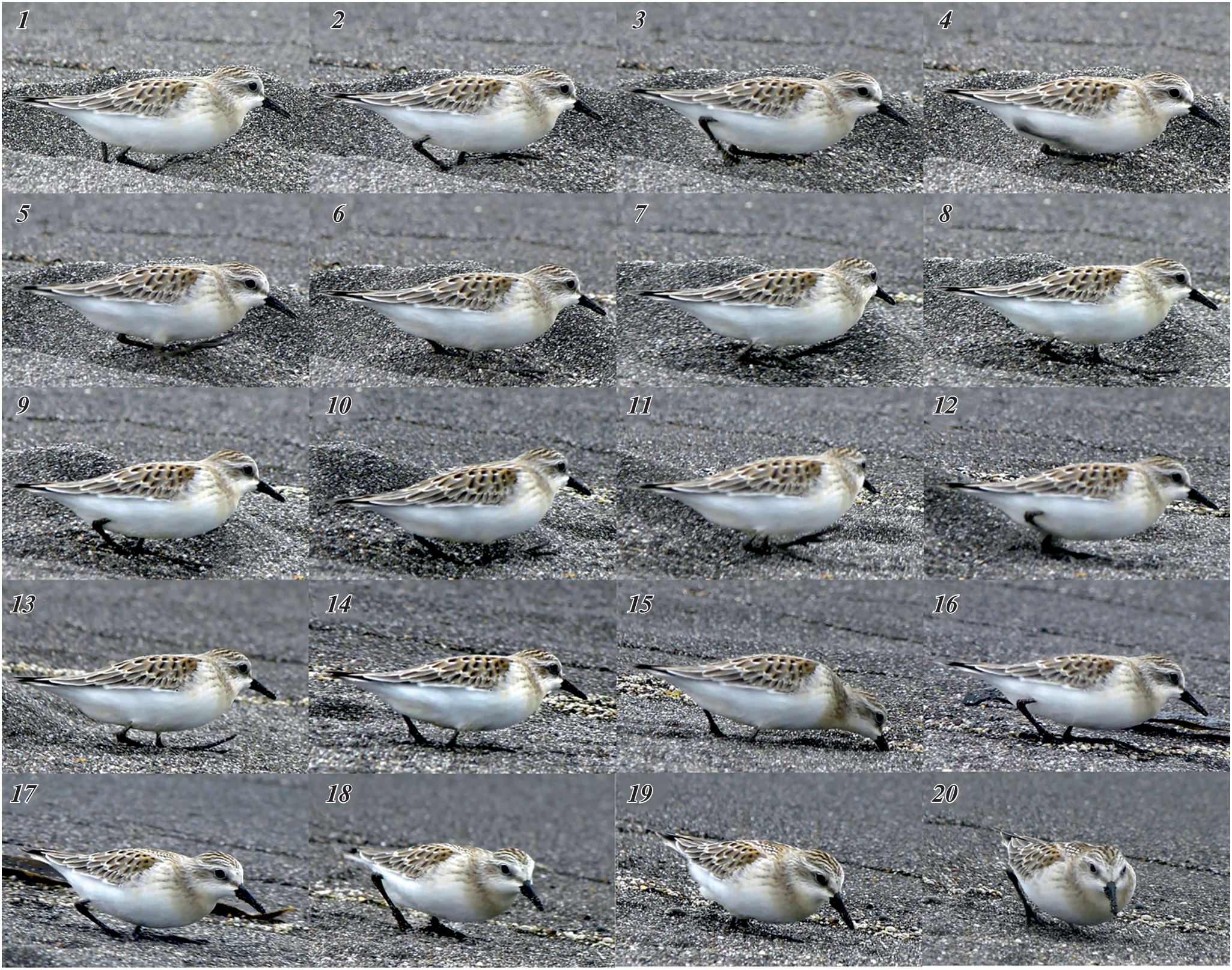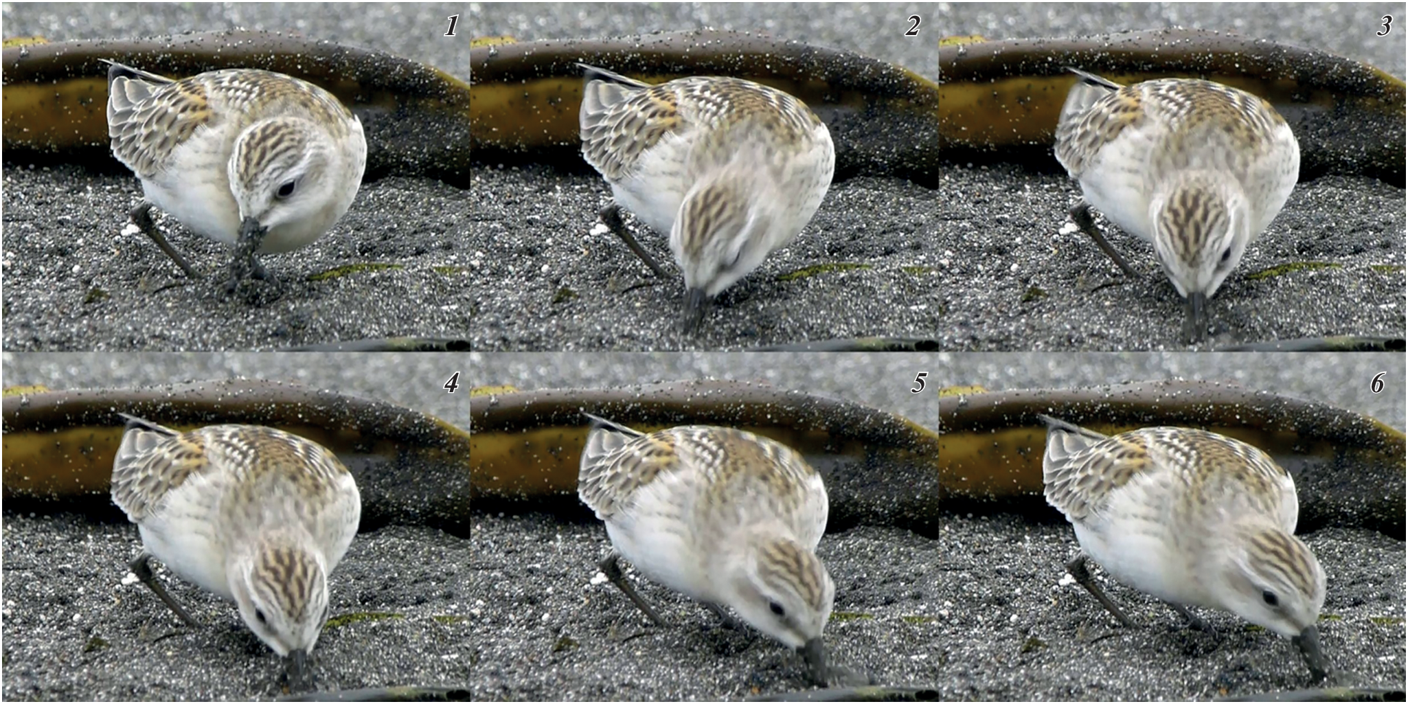 The foraging behaviour of the Red-necked stint (Calidris ruficollis, Scolopacidae, Charadriiformes) was analyzed in detail. The observations were carried out by the authors on the coasts of the Sea of Okhotsk near Magadan and Ola (August 2010), and on Urup Island, Kuriles (August-September 2021, as part of the complex expedition of the second field season “Eastern Bastion – Kuril Ridge”, organized jointly by the Expeditionary Center of the Ministry of Defense of the Russian Federation and the Russian Geographical Society. The diversity of stint species-specific feeding techniques was assessed, and their list compiled, based on a digital coding system. A schematic presentation of the foraging strategies of the Red-necked stint has been proposed.