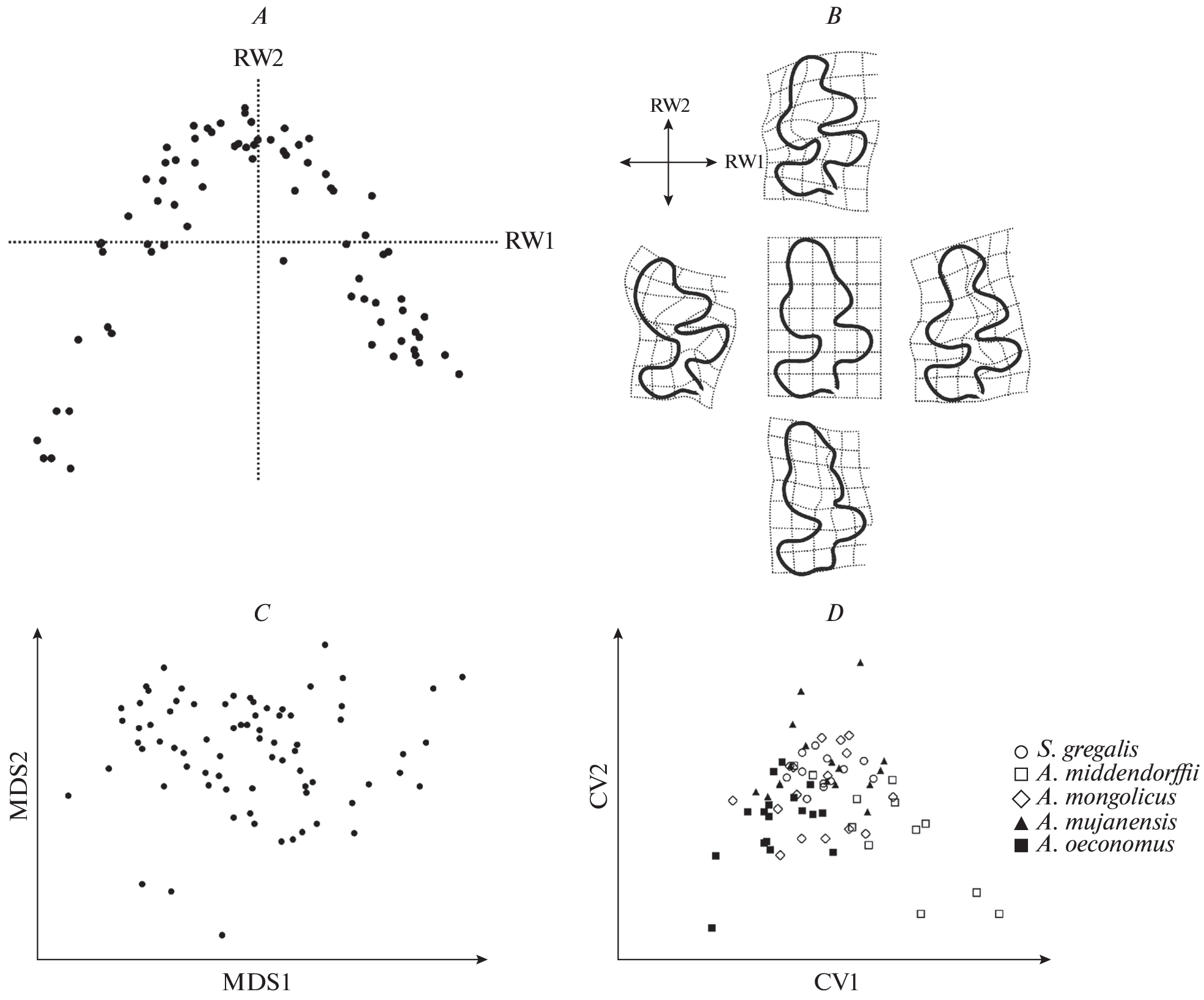 - Voyta L.L., Golenishchev F.N., Tiunov M.P., 2013. Analysis of shape and size variation of the first lower molar in Far-Eastern grey voles of genus Alexandromys (Rodentia: Cricetidae) from Russian fauna using geometric morphometrics // Russian J. Theriol. V. 12. № 1. P. 19–32.
