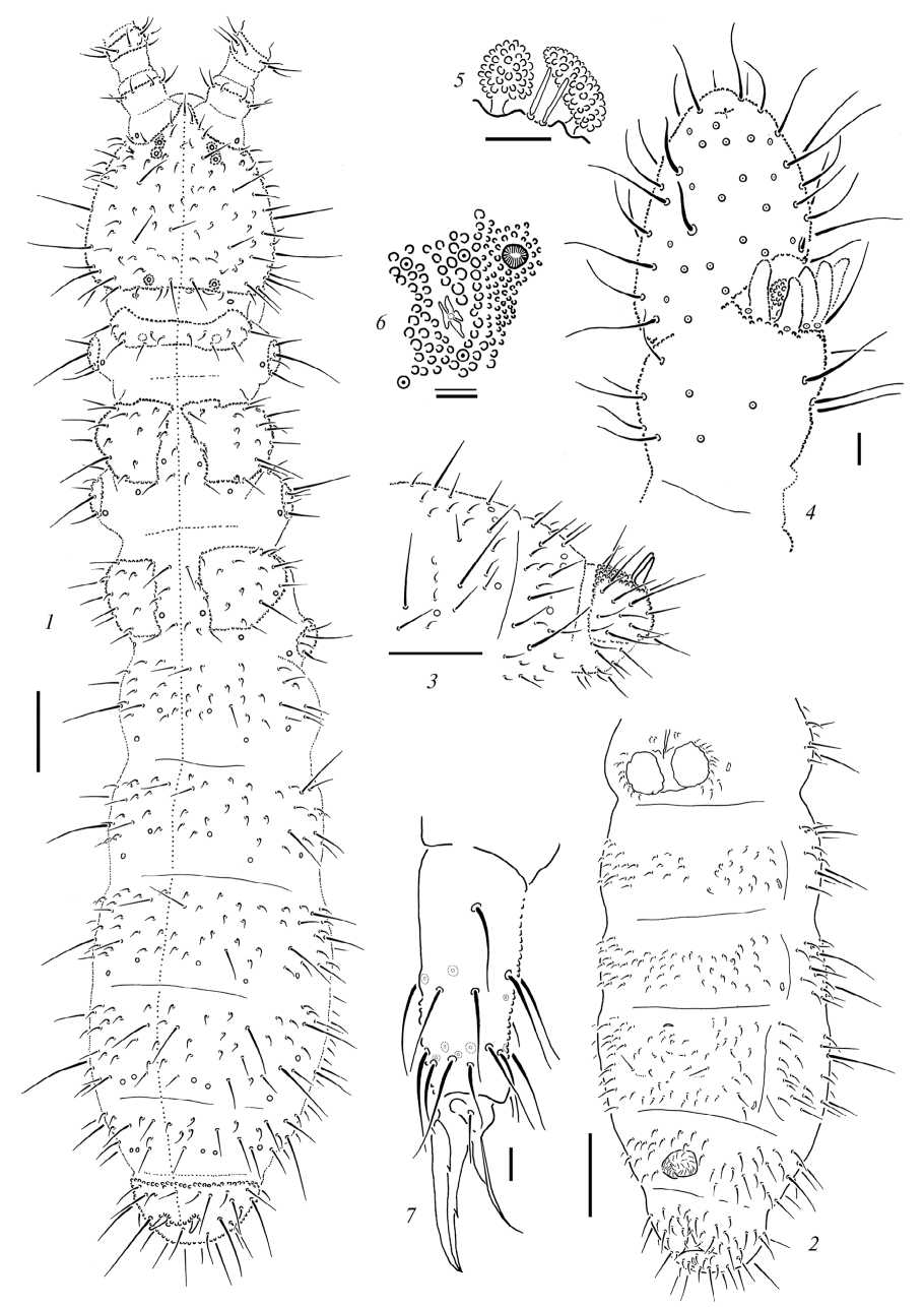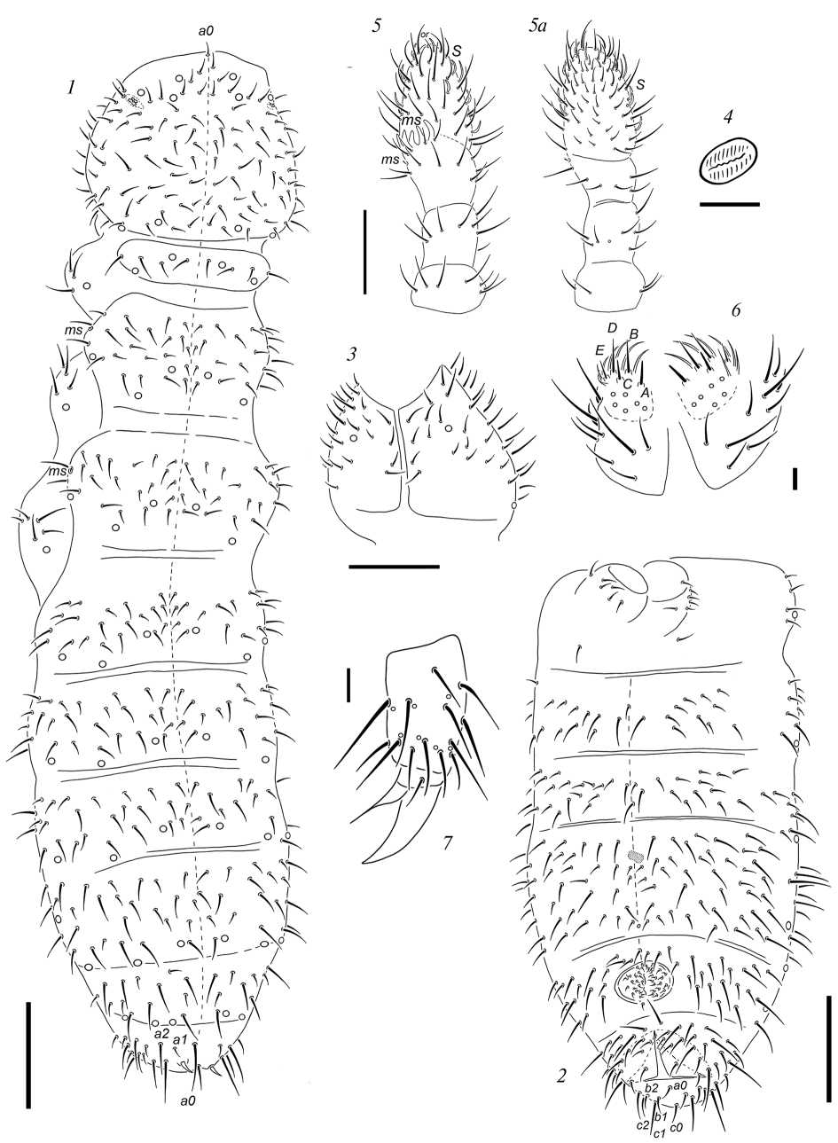 Dorsal setae poorly differentiated into macro- and microsetae, symmetrical in general (Fig. 5, 1). S-setae indistinct. Head with a single axial unpaired seta a0; d0 absent as usual for the genus. Setae p1 on head in front of setae p2. Th. I with 4(5)+4(5) dorsal setae. Lateral ms present on both Th. II and Th. III. Terga of Th. II–Abd. III each with 3–4 pairs of axial setae. On Abd. VI seta a0 similar in length to setae a2, setae a1 three times shorter than a0. Thoracic sterna without setae. Ventral chaetotaxy of abdomen as in Fig. 5, 2.