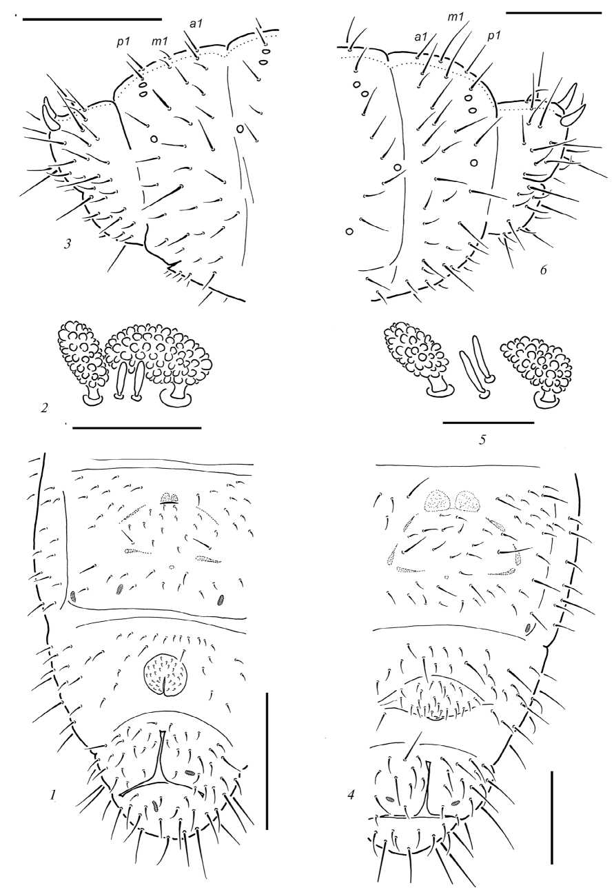 Dorsal chaetotaxy almost symmetrical, especially in medial parts of terga, macrosetae clearly distinguishable only laterally and on abdominal tip (Fig. 6, 1), meso- and microsetae similar in size but differentiated in form: mesosetae usually straight and truncate at tips, microsetae pointed and curved. S-setae not distinguishable as a rule. Head with two axial unpaired setae (a0 and a'0) on frontal part (Fig. 6, 4), d0 being absent as usual for the genus. Setae p1 on head and Th. II–III usually located in front of p2. Th. I with 6–7 dorsal setae on each side. Lateral ms present on both Th. II and Th. III (Figs 6, 3). Terga of Th. II–Abd. III with 3 pairs of axial microsetae and a pair of mesosetae located slightly laterally. Abd. IV–V often with unpaired setae: m0 on Abd. IV and p0 on Abd. V. Setae a0 on Abd. VI slightly shorter than a2, setae a1 almost half as long as a2.