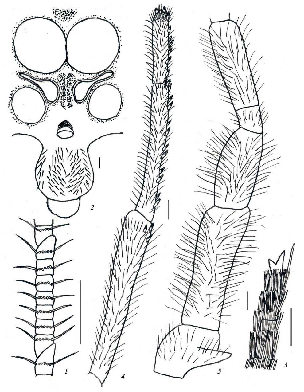 Рис. 1. Ditrigoniophthalmus charyshensis sp. n., детали строения самца: 1 – цепочка жгутика усика во второй четверти от его основания, 2 – передняя часть головы (сложные глаза, парные и непарный глазки, наличник и верхняя губа), 3 – дистальная часть церка, 4 – 6–8-й членики нижнечелюстного щупика, 5 – 1–5-й членики нижнечелюстного щупика (1–5 – голотип, самец). Масштаб 0.1 мм.