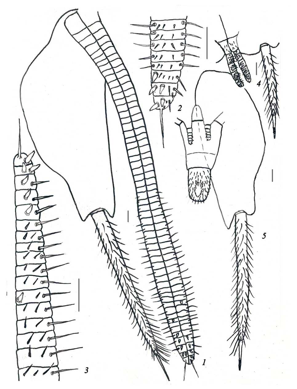 Рис. 3. Ditrigoniophthalmus charyshrnsis sp. n., детали строения яйцеклада самки и полового аппарата самца: 1 – коксит IX сегмента брюшка с грифельком и задние гонапофизы яйцеклада самки; 2 – 1–8-й дистальные членики переднего гонапофиза яйцеклада; 3 – 1–17-й дистальные членики заднего гонапофиза яйцеклада; 4 – передние парамеры, коксит (часть) и грифелек VIII сегмента брюшка самца; 5 – пенис, задние парамеры, коксит и грифелек IX сегмента брюшка самца (1–3 – паратип, самка; 4, 5 – голотип, самец). Масштаб 0.1 мм.