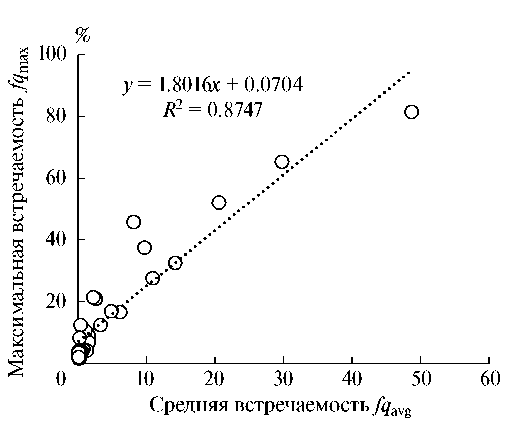 Согласно результатам регрессионного анализа, между показателями средней и максимальной встречаемости существует достаточно тесная связь с высоким коэффициентом линейной корреляции R = 0.935, что позволяет использовать как первый, так и второй показатели (рис. 1).