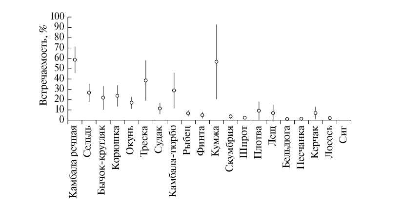 Для определения устойчивости показателей встречаемости можно оценить статистические характеристики средней встречаемости в межгодовом аспекте, например рассчитать доверительный интервал. Как оказалось (рис. 2), за достаточно большой период наблюдения для большинства видов рыб доверительный интервал частоты встречаемости составлял ± 10–20%. Лишь для редких видов он был существенно выше. Например, для кумжи межгодовые колебания встречаемости в уловах в прибрежной зоне достигали ± 30%. Очевидно, что это связано с характером миграций данного вида. Кумжа совершает определенные перемещения в открытом море в течение года и лишь в нерестовой период подходит к устьям рек. В результате встречаемость вида кратковременно повышается в уловах в прибрежной зоне.