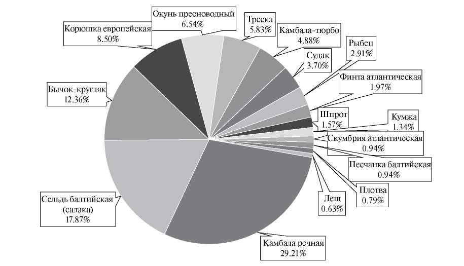 - С целью характеристики ихтиоценоза в целом можно представить его структуру графически в виде круговой диаграммы (рис. 3). Такой подход позволяет констатировать, что основу прибрежного ихтиоценоза по встречаемости составляют камбала речная, салака и бычок-кругляк. Менее часто в уловах регистрируются окунь, треска, камбала-тюрбо, судак, финта, частота встречаемости которых составляет 1–10%.
