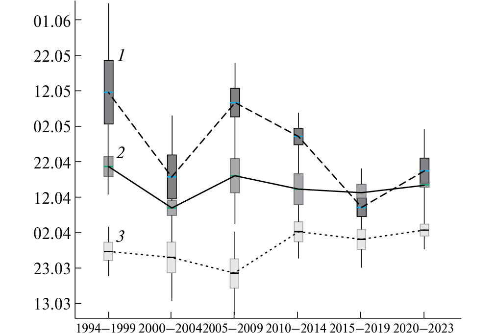 Количество дней между переходом среднесуточных и минимальных температур через 0 °С заметно сокращается (рис. 2), в последнее десятилетие оно в среднем составляет 12±8.9 дней, тогда как в предыдущие 2 десятилетия в среднем было 36±18.7 дней, различия медиан по пятилеткам достоверны (критерий Краскела–Уоллиса: H5;30 = 15.9, p < 0.007). Эта тенденция показывает принципиальные изменения в фенологии весны, сокращение периода собственно весны и быстрое наступление летней фазы, раньше нормы на 18–25 дней.