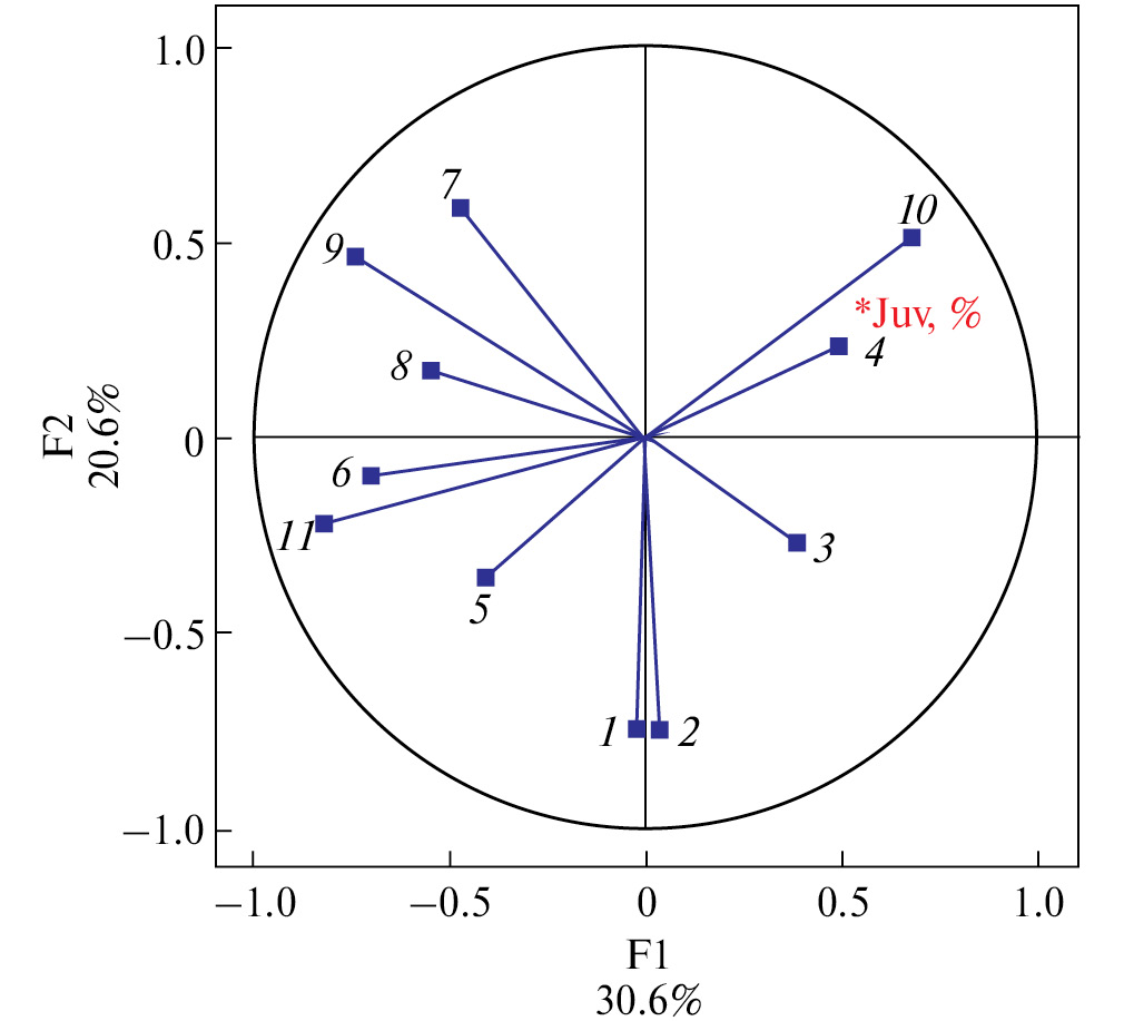 Рис. 5. Результаты объединения параметров методом главных компонент в два фактора: 1 – количество дней между датами перехода среднесуточных температур через 0 °C и через 5 °C; 2 – количество дней между датами перехода через 0 °C среднесуточных температур и минимальных суточных температур; 3 – средняя температура мая, 4 – средняя температура июня, 5 – сумма осадков за май, 6 – сумма осадков за июнь, 7 – объем речного стока в мае, 8 – объем речного стока в июне, 9 – объем речного стока за гнездовой период, 10 – средняя температура за гнездовой период, 11 – сумма осадков за гнездовой период, *juv – доля птенцов в предотлетном скоплении.