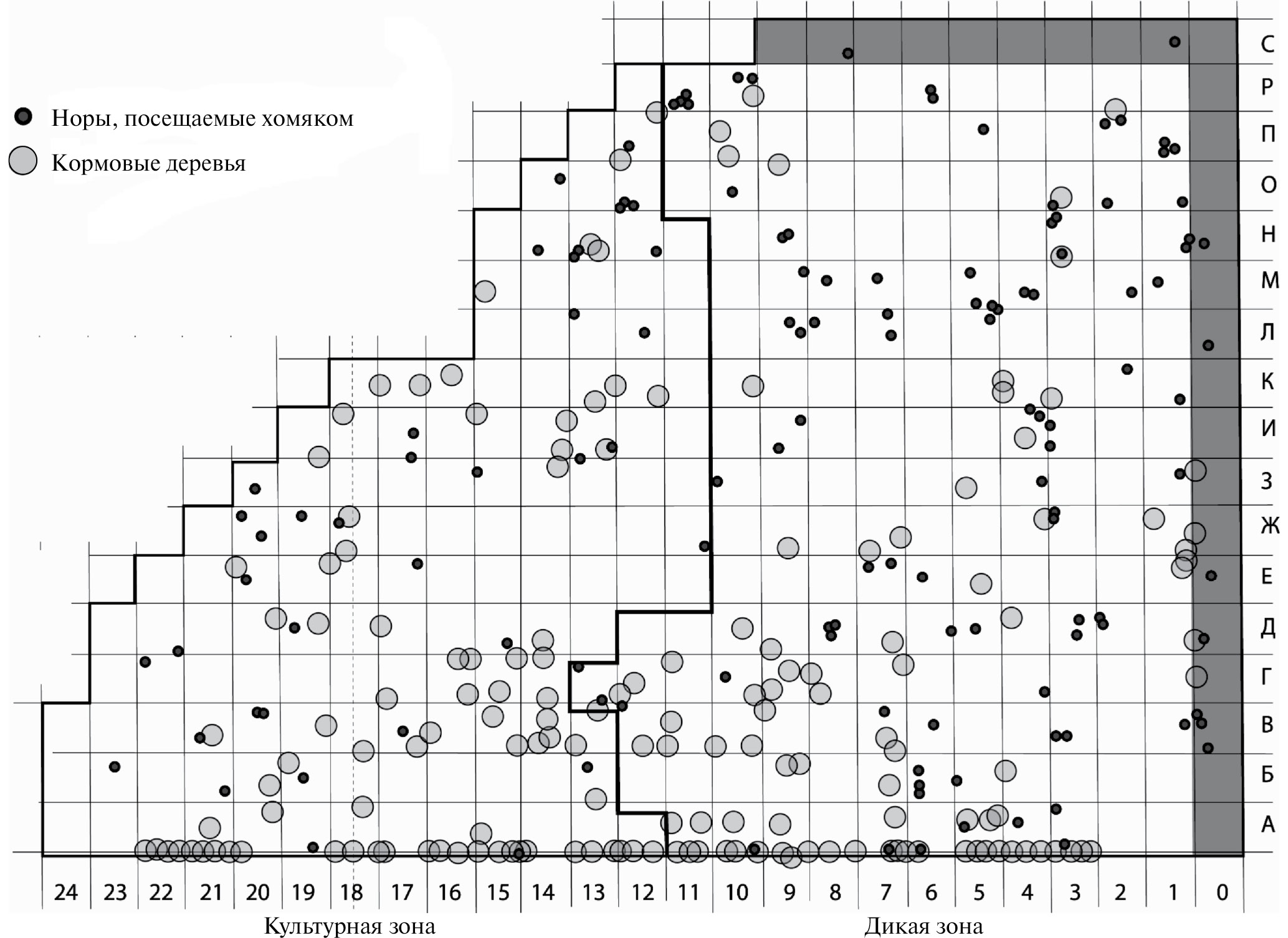 Состав рациона и кормовые условия. По результатам анализа пищевых остатков в выбросах из нор, в рационе хомяка по массе преобладают семена деревьев 1-го и 2-го ярусов четырех видов: алыча, гледичия, грецкий орех, каштан (табл. 1). По нашим наблюдениям, в урожайные годы существенную часть рациона составляет пятый вид – лещина (Corylus sp.). Перечисленные породы мы в дальнейшем будем называть кормовыми деревьями. Семена трав, при весьма большом их количестве, по массе составляют лишь малую долю рациона (табл. 1). По составу кормовой базы разные зоны существенно не различаются. В 2017 г. общее количество кормовых деревьев на полигоне составляло 165 стволов, или 26.5 % всего древостоя. В ходе реконструкции было вырублено 21 кормовое дерево, на состав кормовой базы в разных биотопах вырубка практически не повлияла.