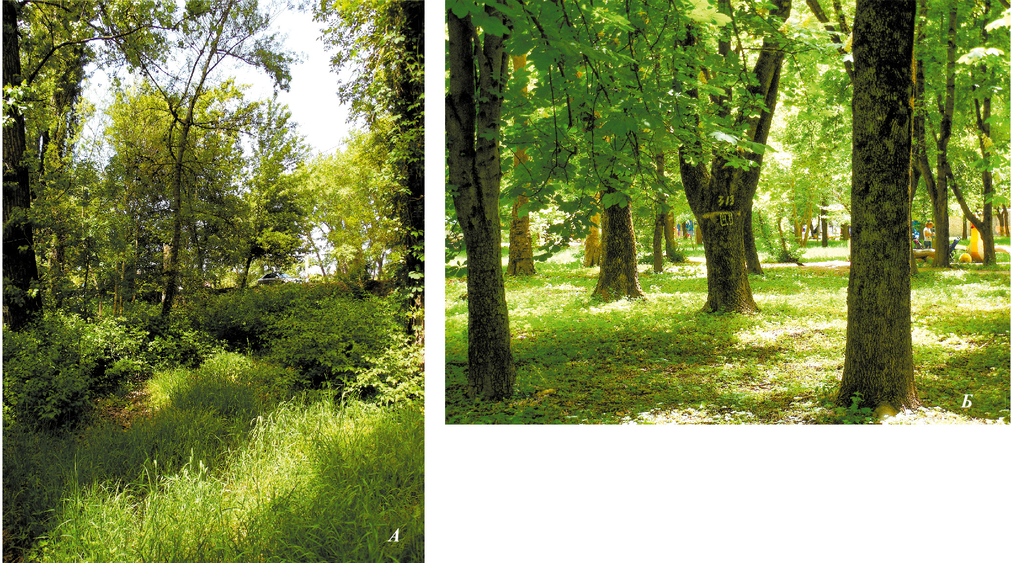 Характер грунта, который в значительной степени определяет возможность устройства нор (Weinhold, 2009; Reiners et al., 2011), на всем пространстве полигона практически одинаков – суглинки с включением гальки. Также указанные биотопы принципиально не различались по сомкнутости крон 1-го яруса (более 60 %) и его составу. Кардинально различались структуры 2-го и приземного ярусов. В дикой зоне 2-й ярус хорошо развит, в приземном ярусе по глазомерной оценке проективное покрытие кустарников составляло до 20–25 %. Густой и высокорослый травяной покров занимал приблизительно 70–80 % площади, в т. ч. и под кронами кустарников. Культурная же зона – это классический парк с высокими старыми деревьями 1-го яруса, 2-й ярус разрежен, кустарники малочисленны (несколько небольших куртин с кронами, поднятыми над землей на высоту 1 м и более), травянистая растительность угнетена (в том числе под кронами кустов) в результате выкашивания и вытаптывания (рис. 3). Граница между биотопами была практически линейна (рис. 2).