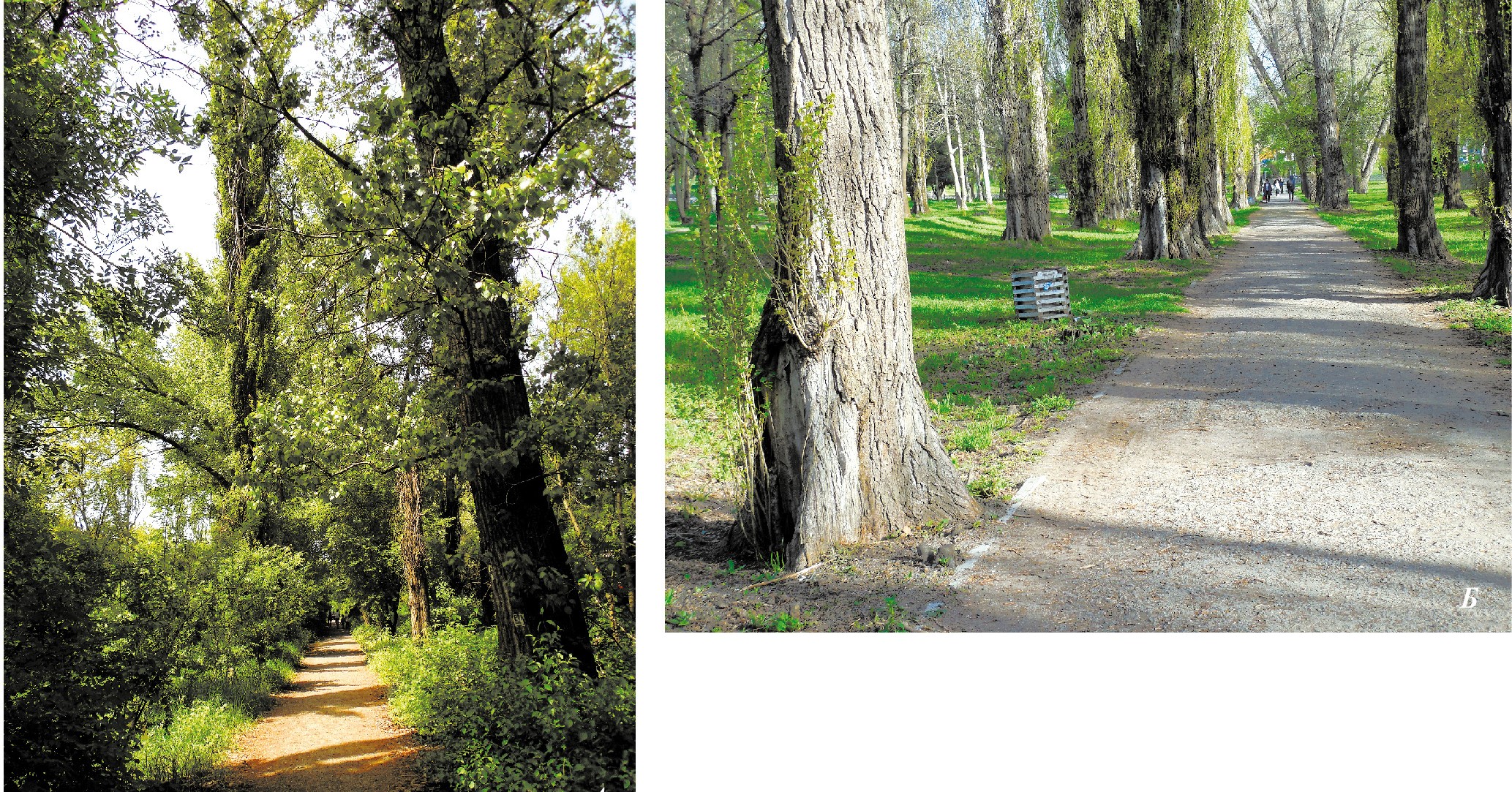 Рис. 4. Состояние приземного яруса растительности в дикой зоне до (А) и после (Б) реконструкции (май 2017 г. и апрель 2022 г. соответственно).