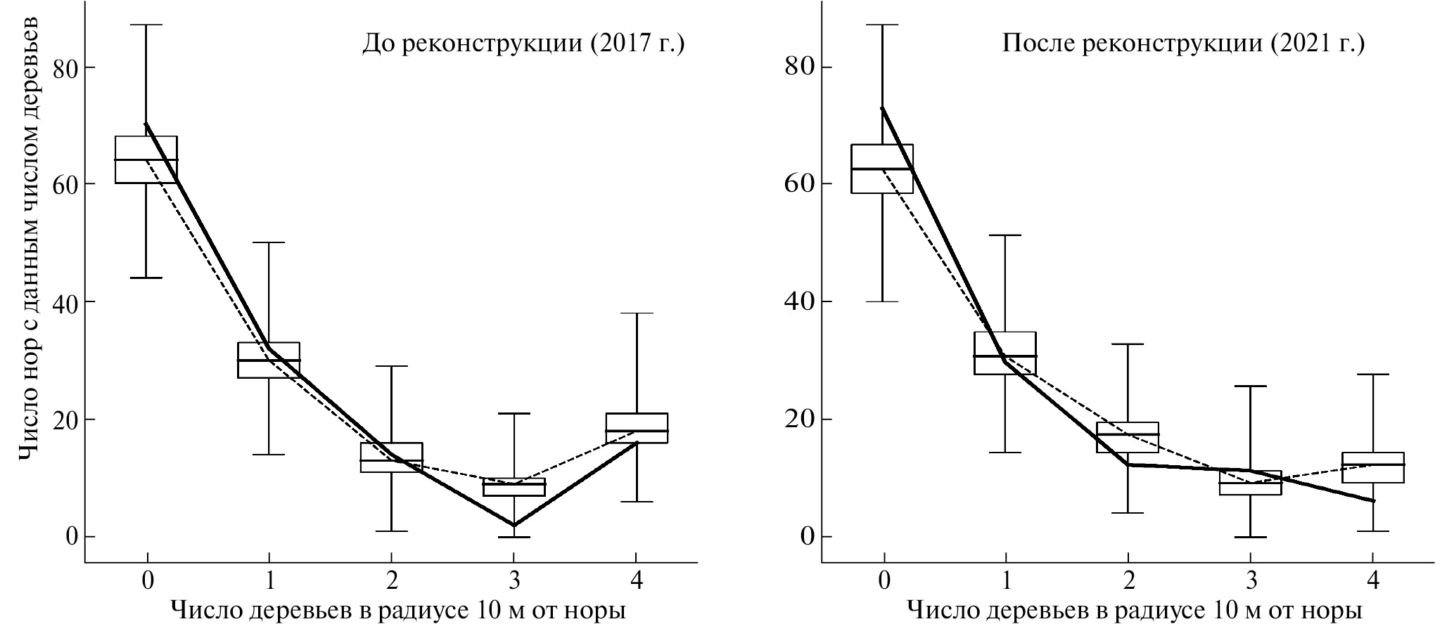 Рис. 5. Зависимость расположения нор от кормовых деревьев. Сплошной черной линией соединены выборочные значения. Пунктирная линия и диаграммы размаха характеризуют аналогичные значения, полученные в 10 000 симуляций случайного заселения. На диаграмме размаха указаны три квартили и лимиты для полученных случайных значений (минимум, первая квартиль, медиана, третья квартиль и максимум).
