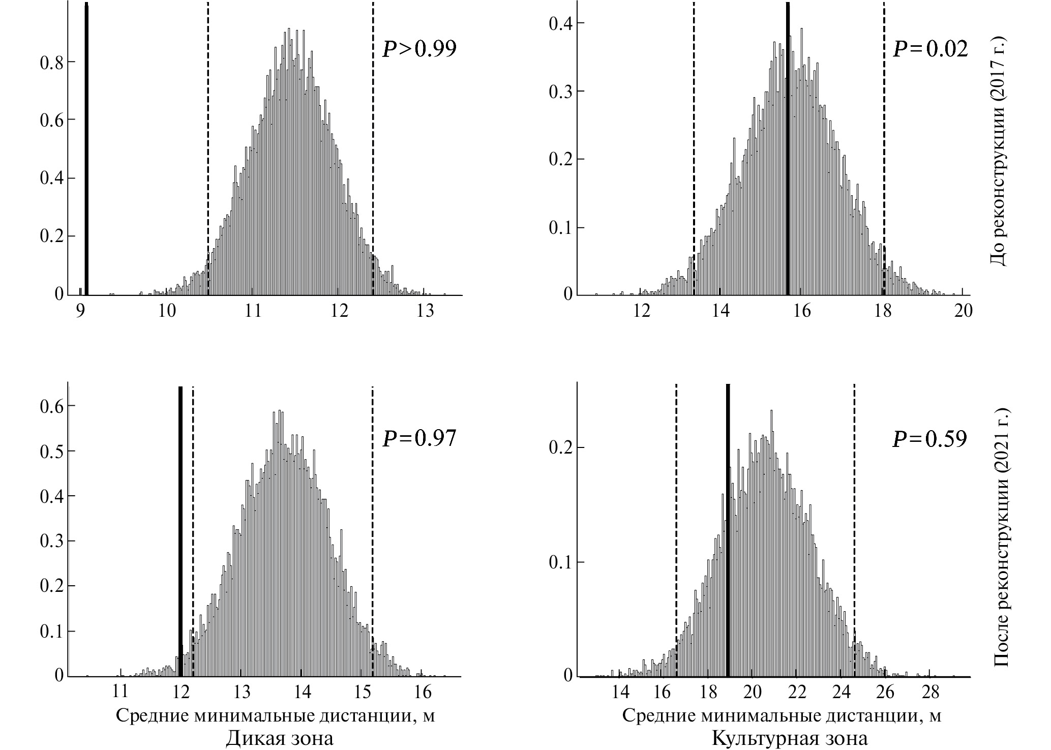 Рис. 7. Уровень агрегированности нор в дикой и культурной зонах парка до и после его реконструкции. Сплошная линия – средняя минимальная дистанция в реальной выборке. Гистограммой представлено распределение средних минимальных дистанций при компьютерных симуляциях случайного заселения территории, пунктирные линии ограничивают 95 % интервал доверительной вероятности. Гистограммы нормированы таким образом, чтобы площадь под графиком равнялась единице.