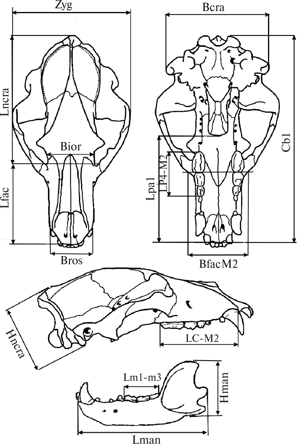 В работе использованы 21 промер и один индекс: 1) Cbl – кондилобазилярная длина, от заднего края средних резцов у альвеол (точка henselion) до заднего края затылочных мыщелков (condylion), 2) Lpal – длина костного нёба, от заднего края средних резцов до заднего выступа костного нёба, 3) Lfac – длина лицевого отдела черепа, от переднего края альвеол средних резцов до переднего края глазницы, 4) Lncra – длина мозгового отдела черепа (neurocranium), от переднего края глазницы до заднего края сагиттального гребня (crista sagittalis), 5) Hncra – высота мозгового отдела черепа (neurocranium) измерена от высшей точки сагиттального гребня до парокципитального отростка (proc. paroccipitalis), 6) Bros – ширина черепа в клыках, 7) Bior – межглазничная ширина черепа, 8) Bfac – ширина черепа на уровне переднего края верхнего моляра M2, 9) Zyg – скуловая ширина черепа, 10) Bcra – мастоидная ширина черепа, 11) Hhoany – глубина хоан (foramen nasale posterior) взята в самой широкой части хоан до верхней поверхности птеригоидных отростков, 12) Bhoany – ширина хоан, максимальное расстояние между птеригоидными отростками (proc. pterygoideum), ограничивающими хоаны (рис. 4), 13) Lman – длина нижнечелюстной кости, от альвеол резцов до конца сочлененного отростка, 14) Hman – высота нижнечелюстной кости в венечном отростке, 15) LC-M2 – длина верхнего зубного ряда, от переднего края клыков до заднего края M2 (у альвеол), 16) LP4-M2 – длина верхнего ряда щечных зубов от премоляра P4 до моляра M2, 17) Lm1-m3 – длина нижних моляров, 18) LM2 – длина второго верхнего моляра, 19) BM2 – ширина второго верхнего моляра, 20) Lm2 – длина второго нижнего молярa, 21) Bm2 – ширина второго нижнего моляра, 22) Hhoany х Bhoany – индекс площади поперечного сечения хоан (мм2).