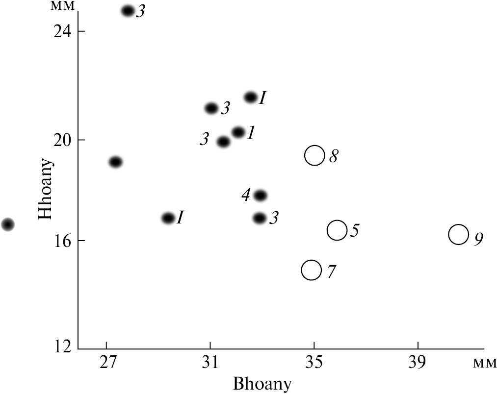 Рис. 5. Различия самцов бурого медведя Тибета по ширине (Вhoany) и глубине (Hhoany) хоан: черные кружки – популяция-I, белые кружки – популя- ция-II. Цифрами обозначены местонахождения коллекционных экземпляров (соответствуют рис. 1).