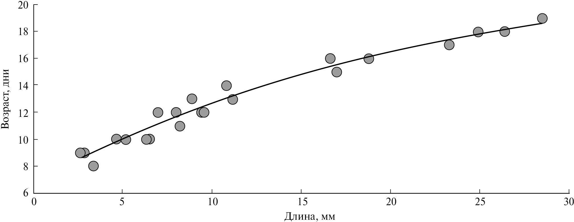 Зависимость средней длины эмбрионов (мм) от возраста (дни) подчиняется квадратичной функции (R2 = 0.978):