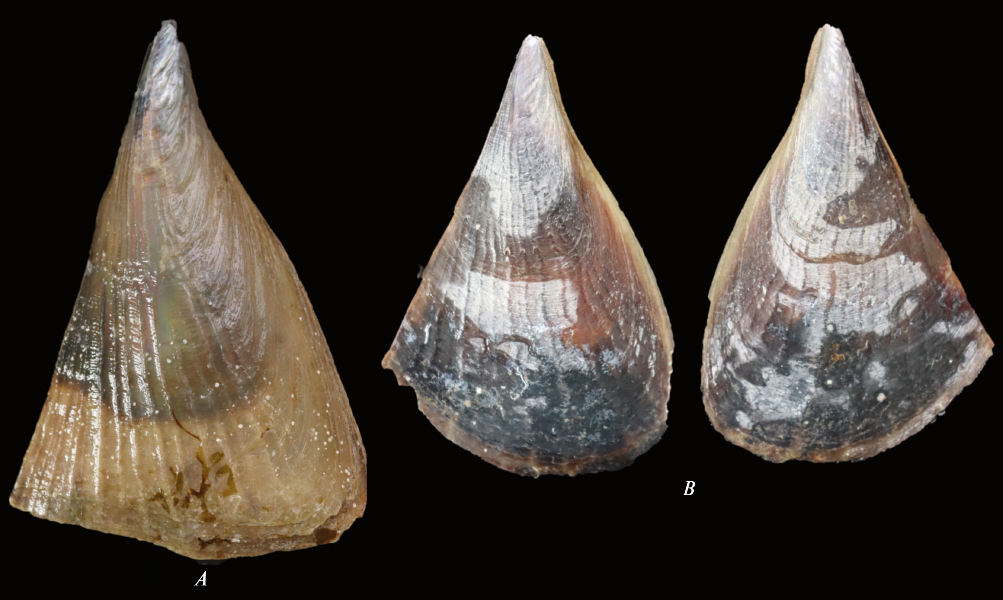 Description. Shell medium sized, reaching 8–14 cm in length. Sculpture consists or numerous fine concentric lines and growth pauses. Colour externally purplish (under the greenish periostracum) and internally whitish.