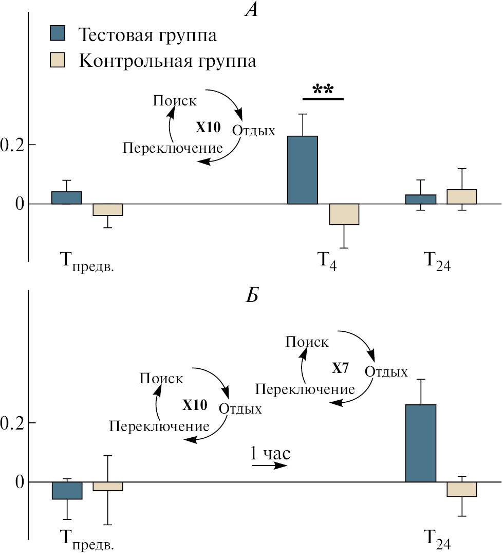 В предварительном тесте (Тпредв.) нет различий между тестовой и контрольной группами, особи проводят сравнимое количество времени во всех секторах арены. Процент времени (рис. 1А), проведенного в целевом секторе через 4 ч (Т4) после обучения, у тестовой и контрольной групп достоверно различается (t-test, df = 38, F = 4.601, t = 2.812, p = 0.008), как и индекс обучения (рис. 2А) (t-test, df = 38, F = 1.139, t = –2.964, p = 0.005). В эксперименте с одним сеансом обучения не наблюдается различий между тестовой и контрольной группами через 24 ч (Т24) после обучения.