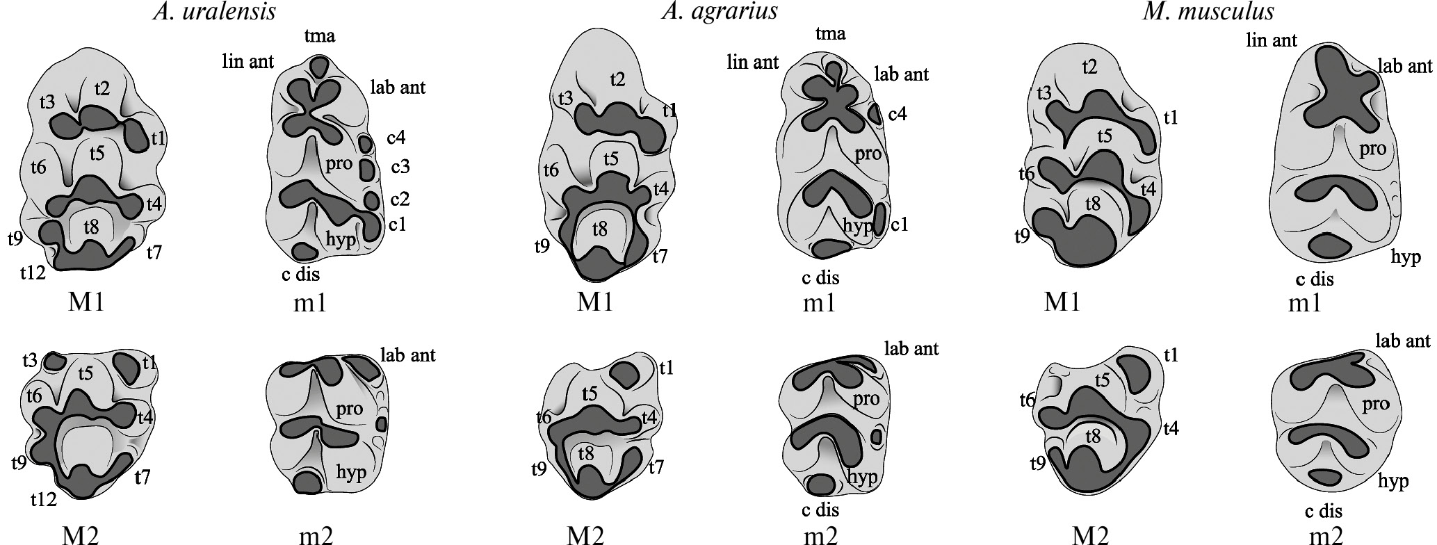 Наиболее точными морфологическими структурами, позволяющими надежно диагностировать представителей семейства Muridae, является морфология бугорков жевательной поверхности. Конфигурация бугорков жевательной поверхности так же подвержена изменчивости, причем нижние зубы более консервативны, чем верхние (Несин, 2013). Во избежание путаницы в номенклатуре бугорков, необходимо использовать унифицированную схему. В настоящее время в литературе встречается различные варианты номенклатуры бугорков жевательной поверхности мышей. Детальный анализ различных подходов к обозначению элементов жевательной поверхности выполнен Несиным (2013). Мы в своей работе следуем рекомендациям этого автора, принимаем номенклатуру бугорков по Сторху (Storch, 1987) (рис. 2).