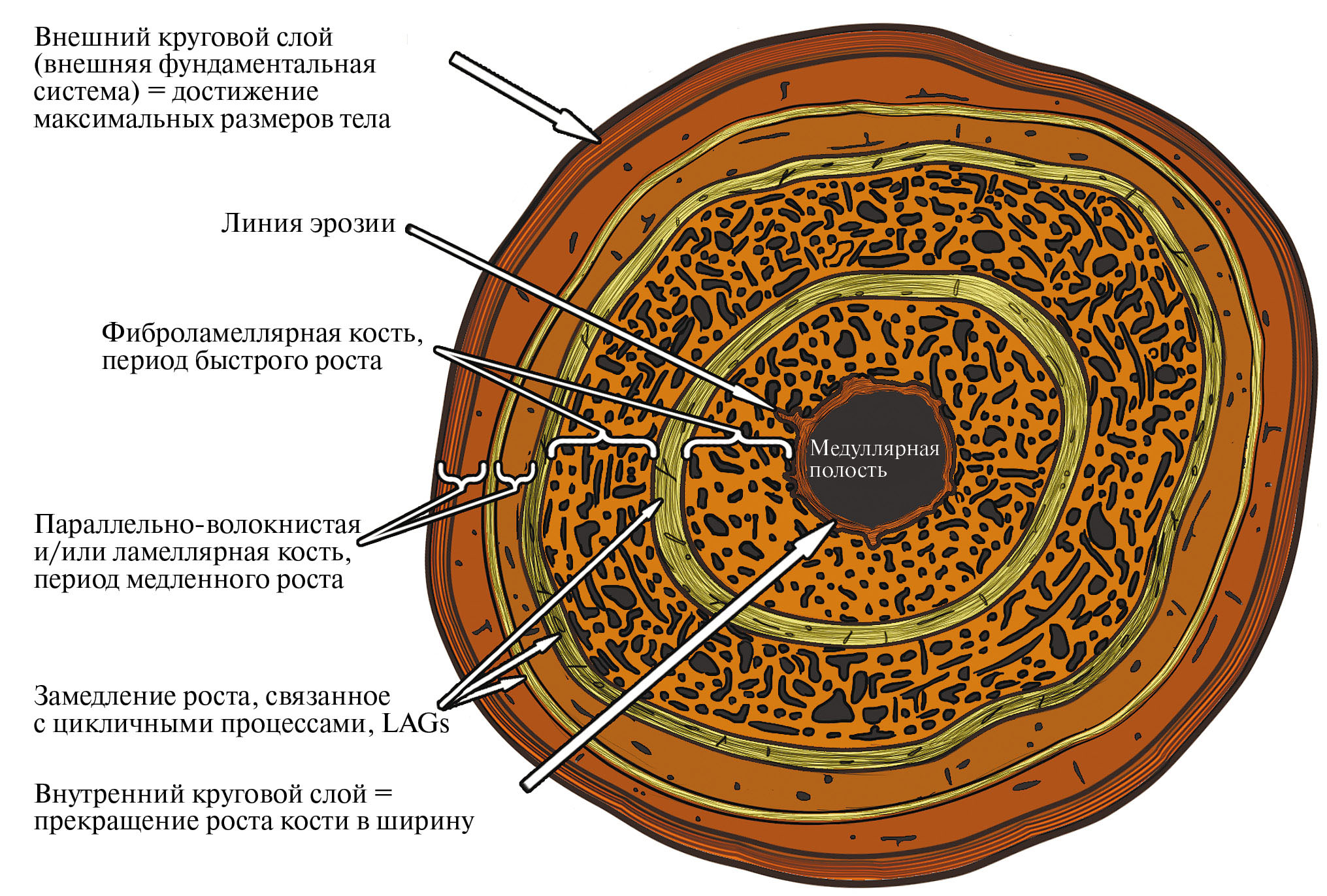 Следует отметить, что просто прямой подсчет ростовых меток дает нам гипотезу об индивидуальном возрасте (сколько лет жило животное), но для определения онтогенетической стадии (молодой, субадультный, взрослый) мы используем другие гистологические маркеры – изменения расстояния между ростовыми метками, изменения типа костного матрикса и васкуляризации, формирование внешней фундаментальной системы (см. соответствующие разделы ниже, а также рис. 1–3 в качестве схем и рис. 4–5 как примеры).