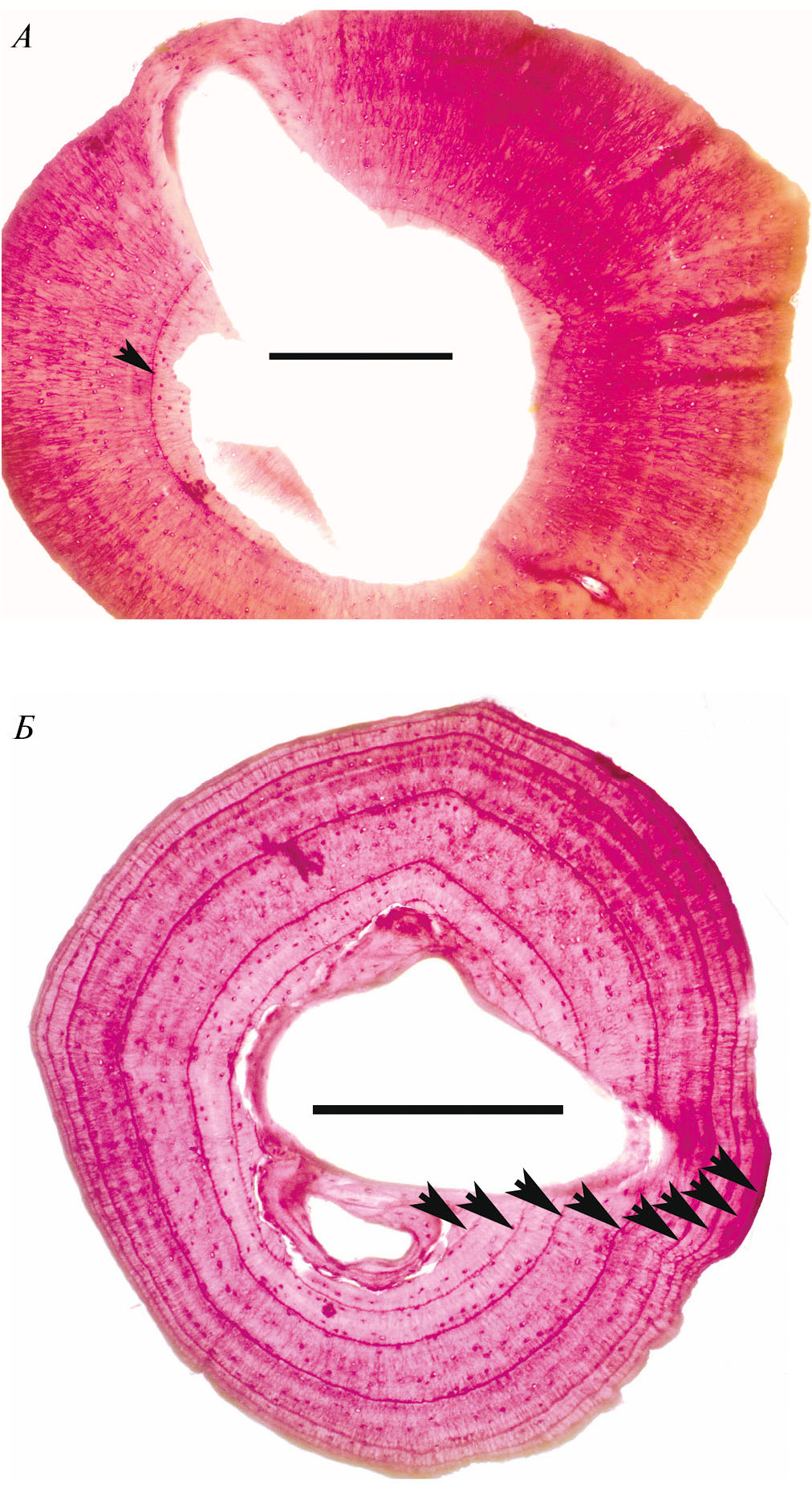 Рис. 2. Примеры быстрого (А) и медленного (Б) роста, оцениваемого по относительному расстоянию между LAGs. Приведены срезы голени остромордых лягушек из популяций: А – Брянского леса, половозрелый самец, длина тела 64 мм, 2 зимовки и Б – Югана, половозрелая самка, длина тела 58 мм, 9 зимовок. Описание популяций – см. Ляпков, 2021. Длина отрезка 1 мм.