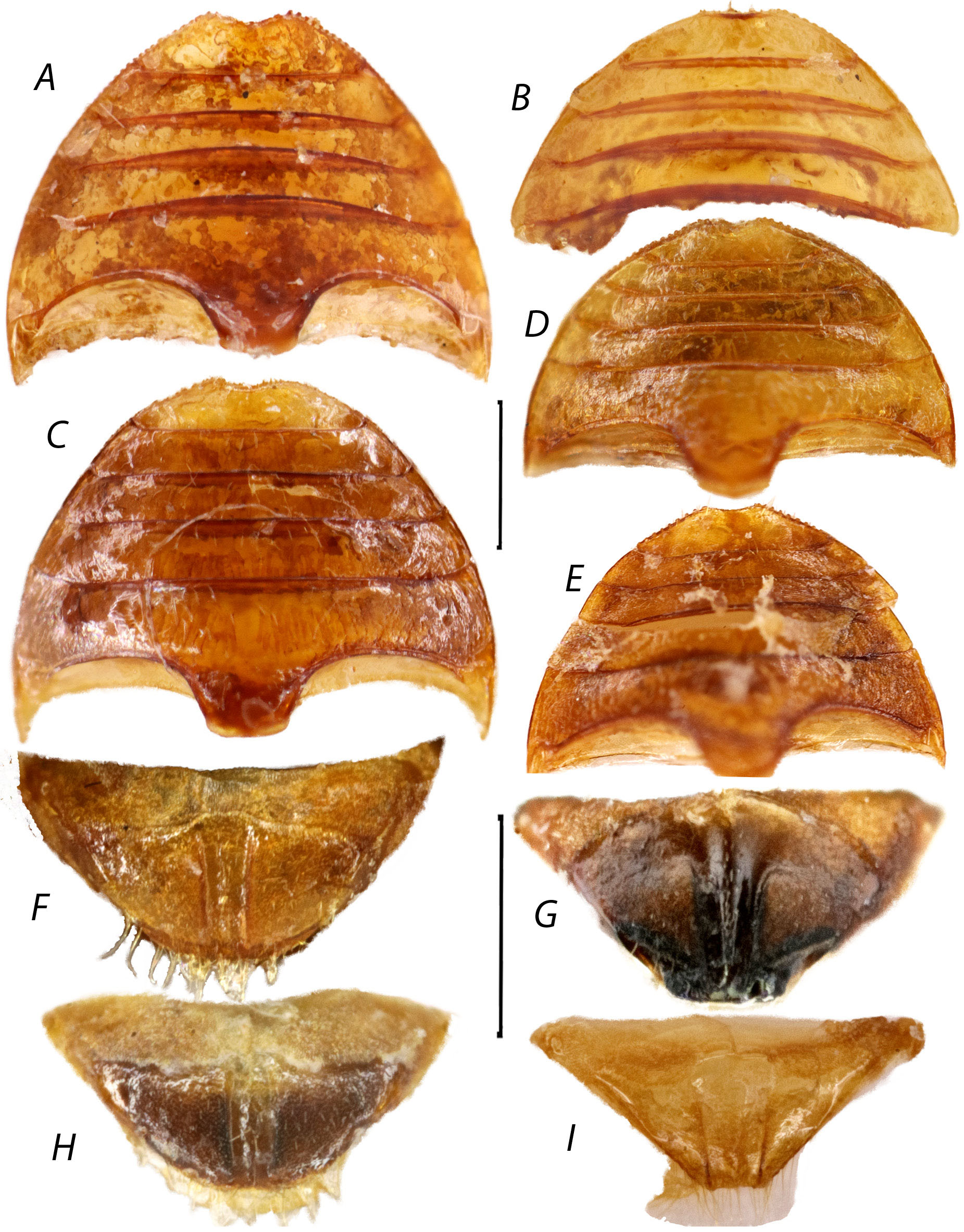 Брюшко без вторичнополовых образований, пятый вентрит с широкой треугольной выемкой на апикальной стороне; его боковые стороны четко зазубрены. Пигидий с неглубокой срединной бороздкой, слегка расширяющейся в основании, далее постепенно сужающейся к вершине, дно бороздки без киля.