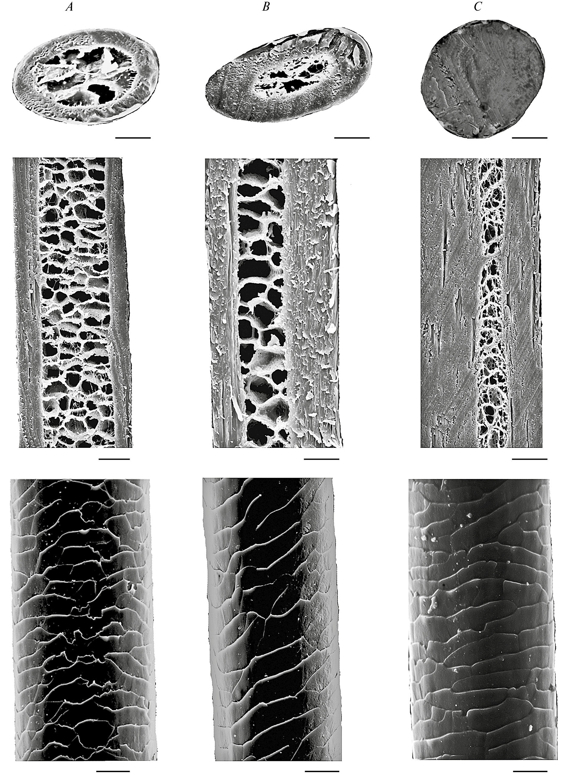Рис. 3. Микроструктура остевых волос холки домашней лошади мезенской (A, B) и ахалтекинской (C) пород. A – ость зимней шерсти; B, C – ость летней шерсти. Сверху вниз – поперечные сечения, продольные сечения стержня, орнамент кутикулы. Данные СЭМ. Масштаб 10 мкм.